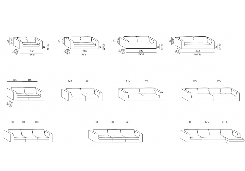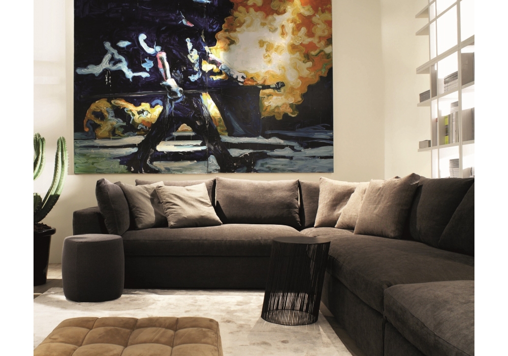 Louis Small designed by Andrea Parisio for Meridiani is a sofa with wooden frame and non-deformable polyurethane padding. Black ABS feet. Upholstery available in fabric or leather. Made of different sizes with possibility of different modular configurations.