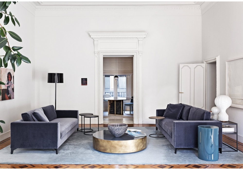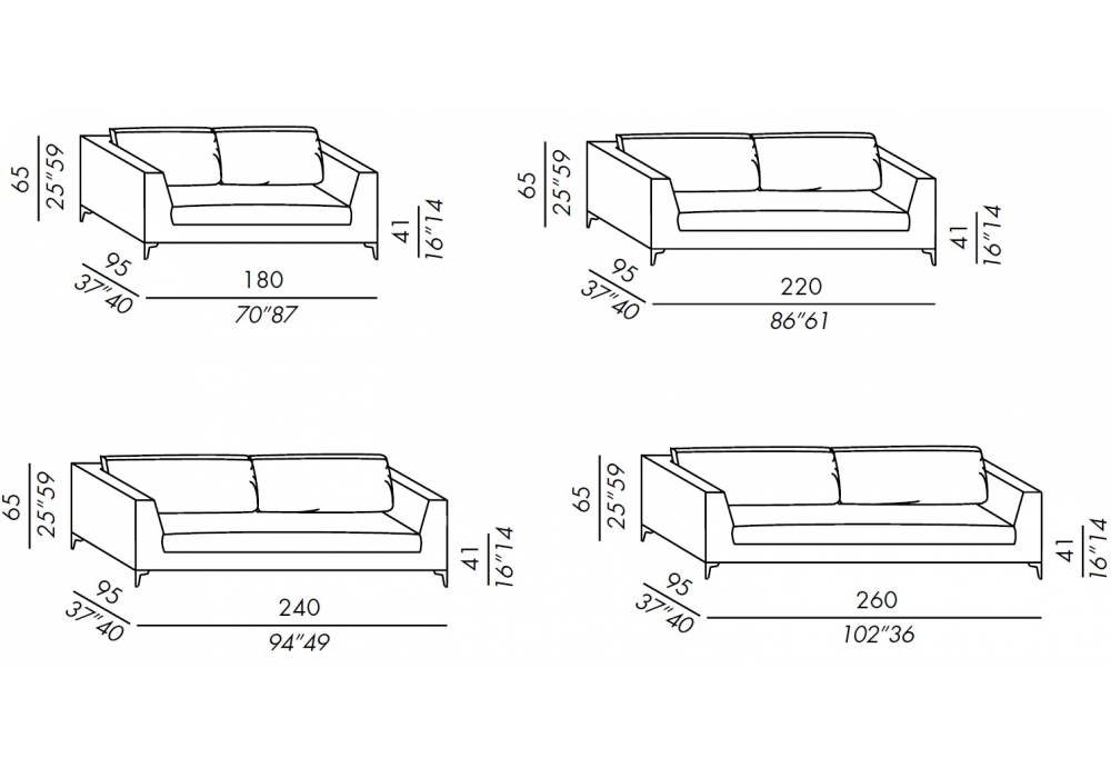 Louis Up designed by Andrea Parisio for Meridiani is a sofa with wooden frame and non-deformable polyurethane padding. Feet in metal painted matt black, black nickel or chrome.. Upholstery available in fabric or leather. Made of different sizes with possibility of different modular configurations.