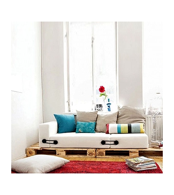 Trix von Piero Lissoni für Kartell entworfen, ist ein Sofa, das aus drei verschiedenen Elementen besteht, die durch ein elegantes Gummibandsystem miteinander verbunden sind. Hergestellt aus Polyurethanschaum mit Stoffbezug.