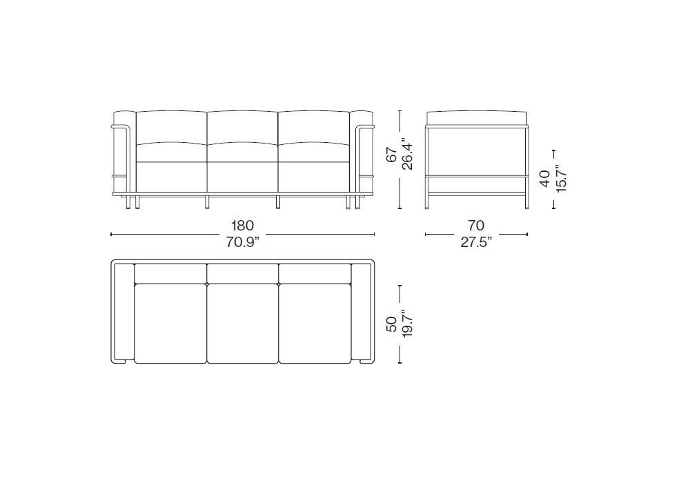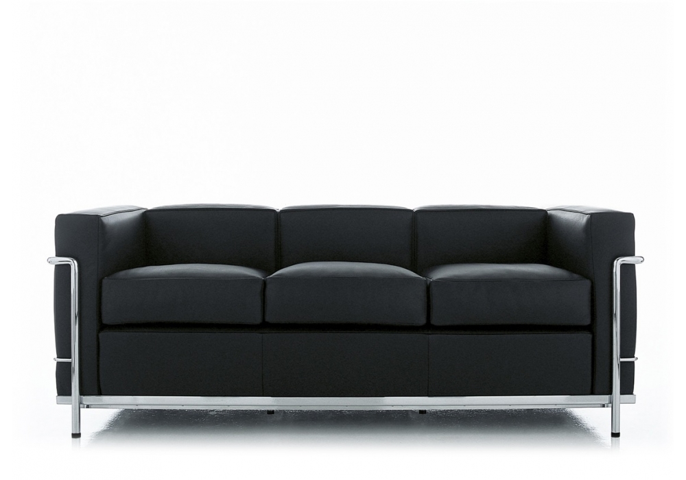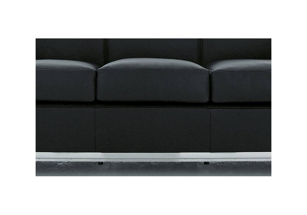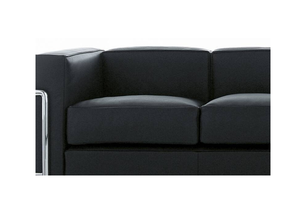 2 Fauteuil Grand Confort, Petit Modèle, Trois Places von Le Corbusier, Pierre Jeanneret, Charlotte Perriand für Cassina entworfen, ist ein 3-Sitzer-Sofa mit verchromter oder lackierter Struktur und gepolsterten Kissen mit Stoff- oder Lederbezug.