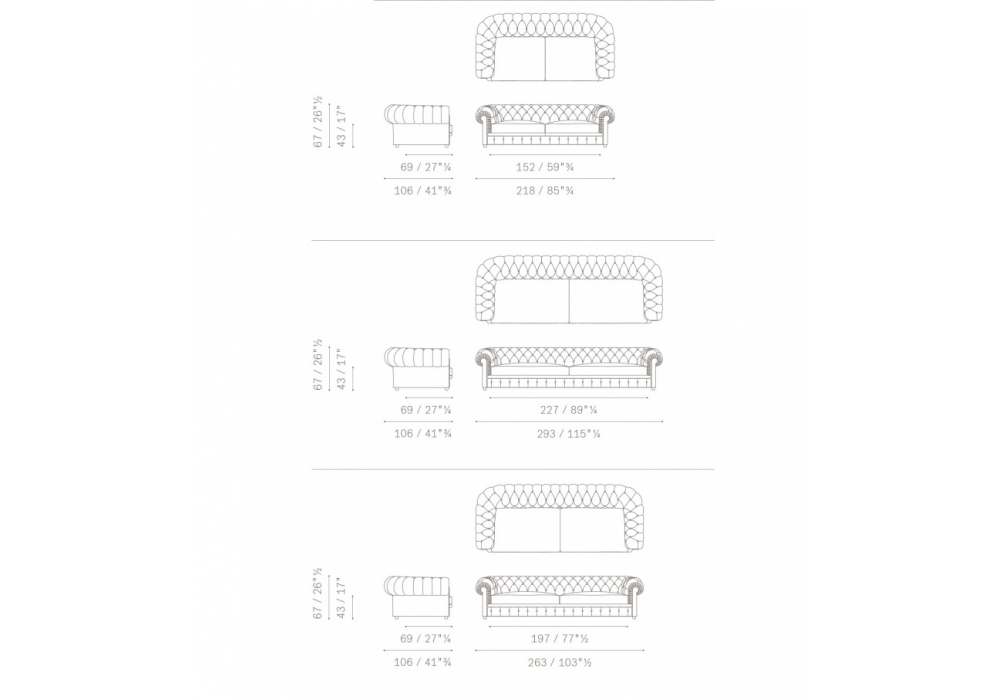 Chester One, von Poltrona Frau entworfen, ist ein Sofa mit einem Gestell aus abgelagertem Buchenholz und einem Sitzkissen mit Gänsedaunenfüllung. Die Rückenlehne und die Armlehnen haben ein handgefertigtes Capitonné-Design. Die äußere Rückenlehne ist mit einer Reihe von lederbezogenen Nägeln versehen. Die Füße sind in folgenden Ausführungen erhältlich: kugelförmig (6 cm) oder hoch (12 cm) aus dunkel nussbaumfarben gebeiztem Buchenholz oder schwarz lackiertem Buchenholz; Holzfüße (13,7 cm) mit Lederbezug.