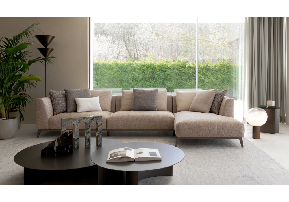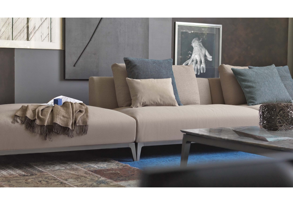 Olivier von Emanuela Garbin & Mario Dell’Orto für Flou entworfen, ist ein modulares Sofa, das in verschiedenen Konfigurationen erhältlich ist. Stahlrohrstruktur, Oberflächenausführung brüniert matt, stützende Fläche mit Geflecht aus elastischen Riemen, Jersey Bezug. Sitzfläche und Rückenlehnen mit abziehbarem Bezug aus Stoff oder Leder.
