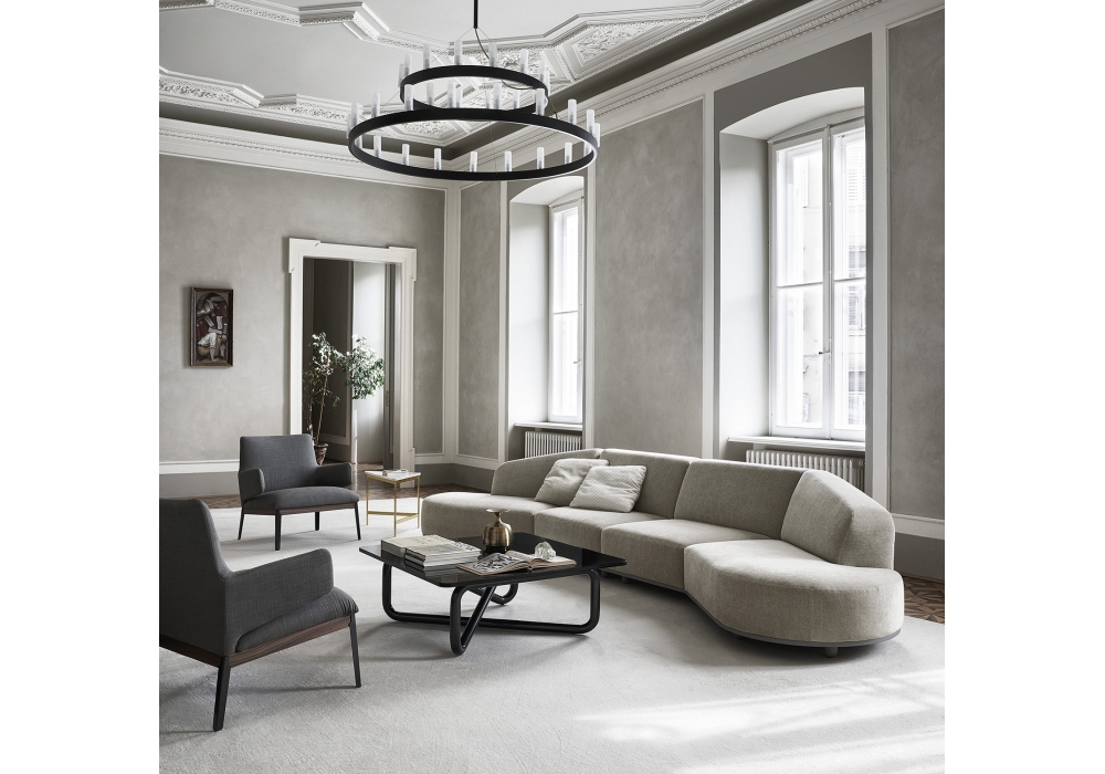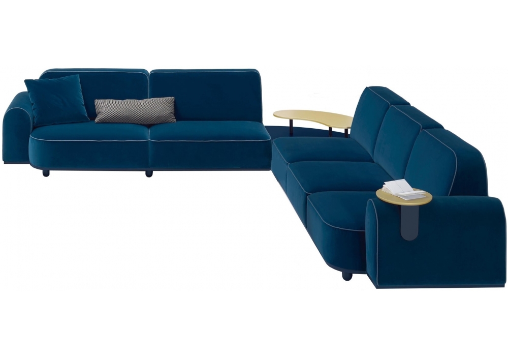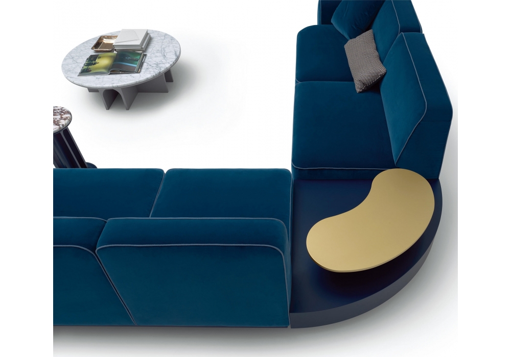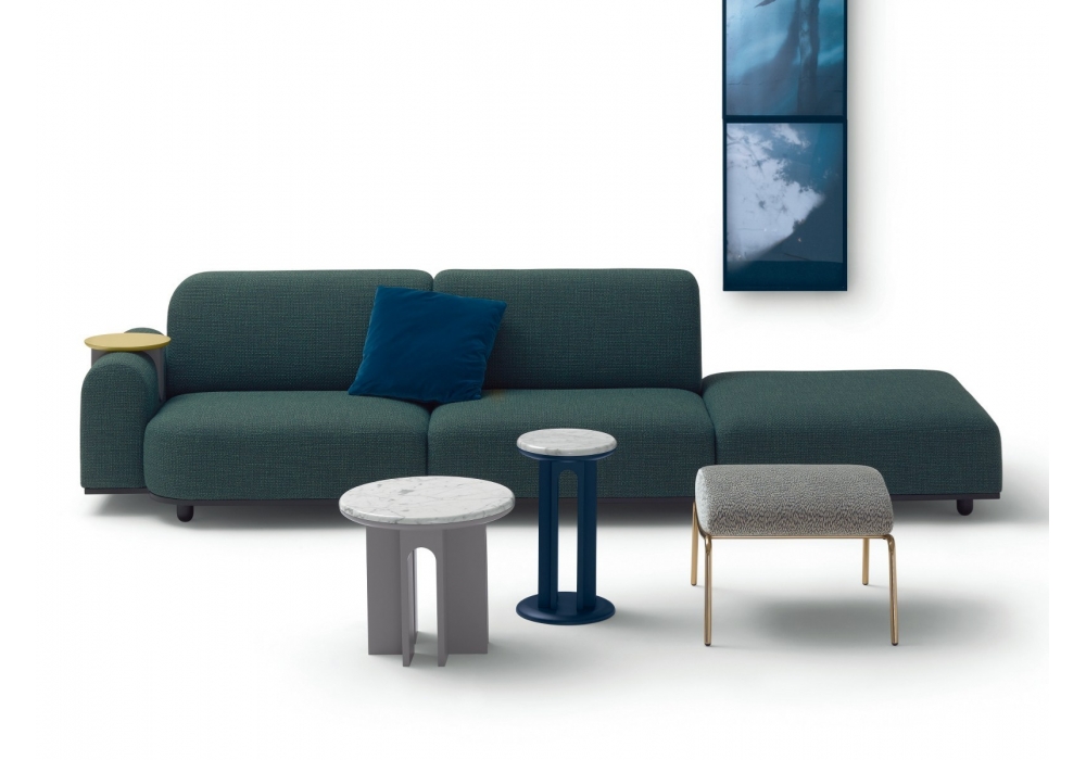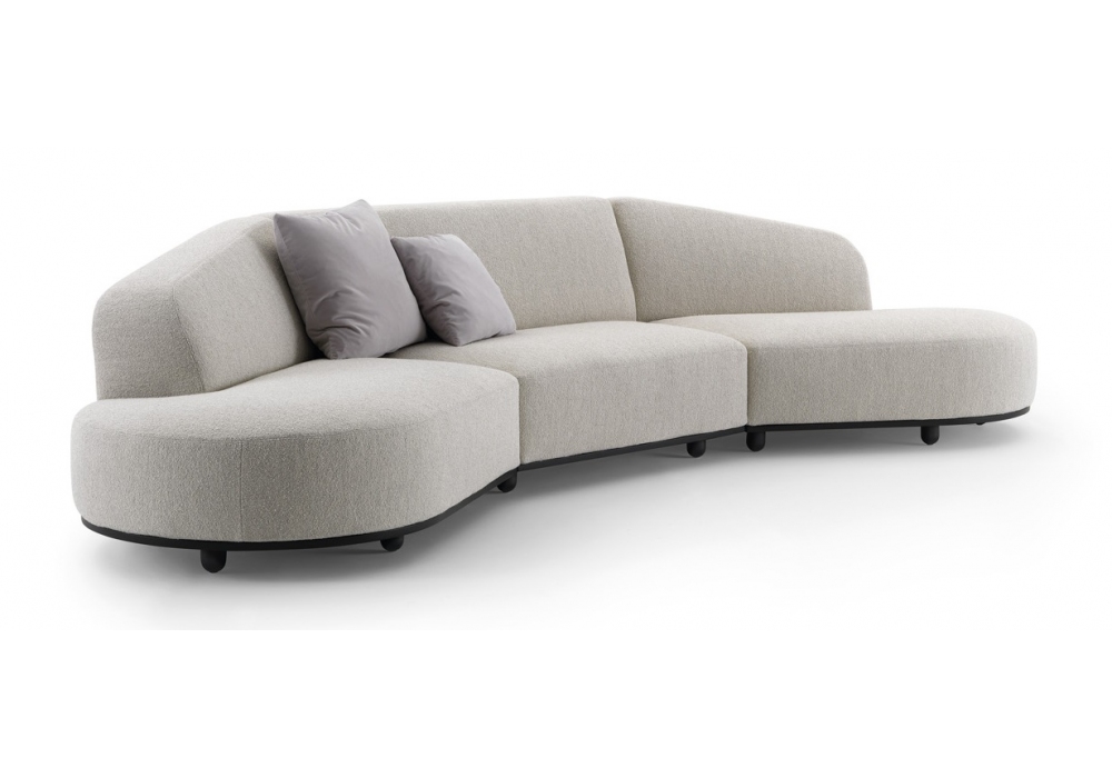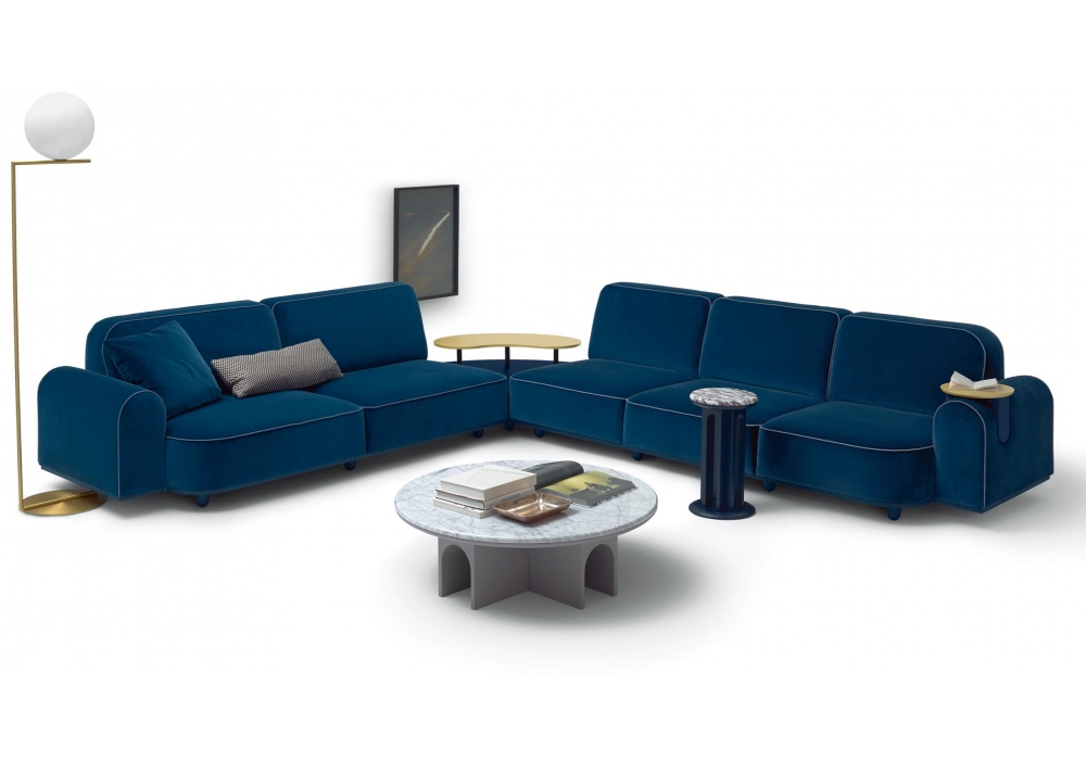 Arcolor von Jaime Hayon für Arflex entworfen, ist ein modulares Sofa mit lackierter MDF-Basis und Eschenfüßen. Sitzkissen, Rückenlehne und Armlehne aus geformtem Polyurethan mit differenzierter Dichte / Polyesterfaser. Stoffpolsterung.