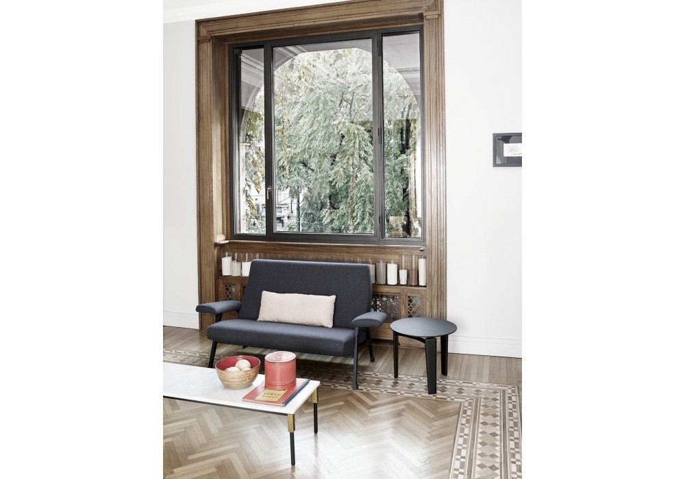 Hall von Roberto Menghi für Arflex entworfen, ist ein Sofa mit gebeizter Holzstruktur, Polsterung aus geformtem Polyurethan/Polyesterfaser und Bezug aus Stoff oder Leder.