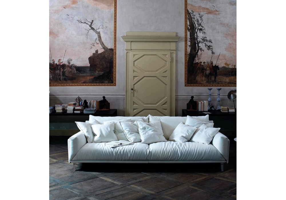 Faubourg von Carlo Colombo für Arflex entworfen, ist ein festes Sofa mit Bezug aus Stoff oder Leder. Füße in schwarzem oder brüniertem Lack. Sitzkissen aus geformtem Polyurethan mit differenzierter Dichte / Polyesterfaser. Rückenkissen mit Gänsedaunen- / Antifederfutter.