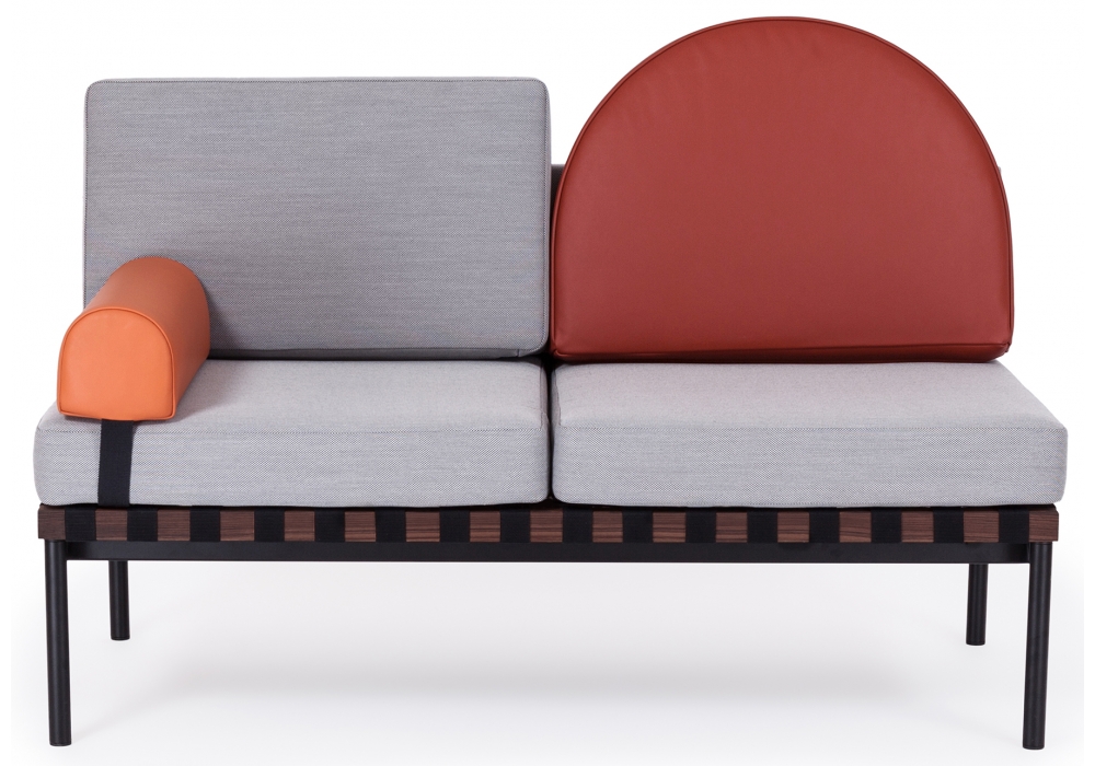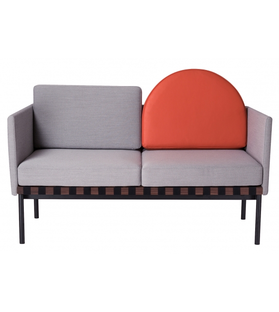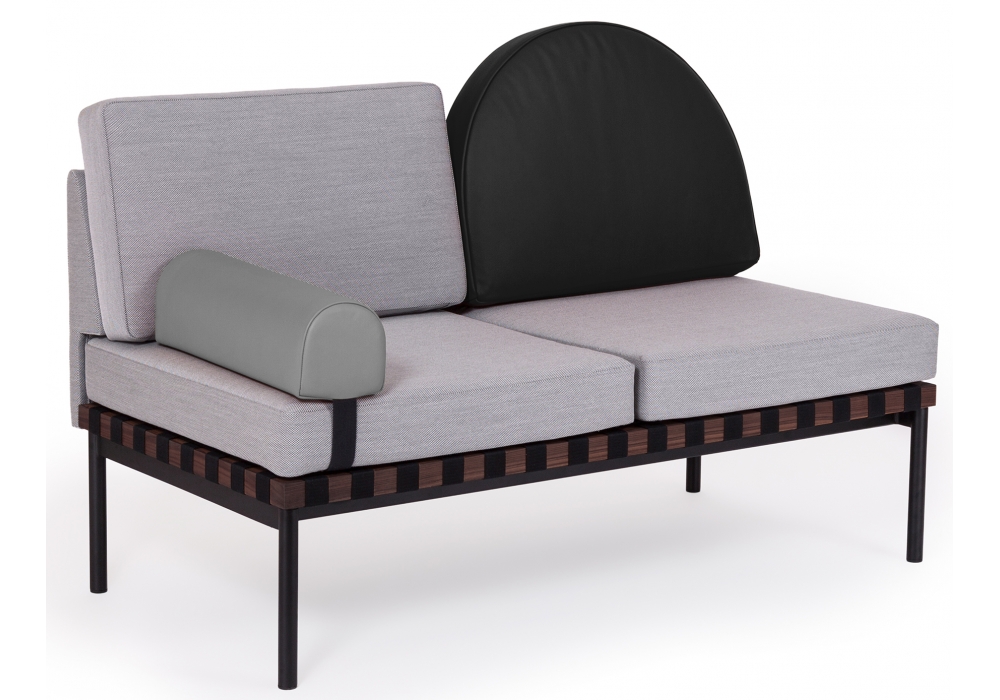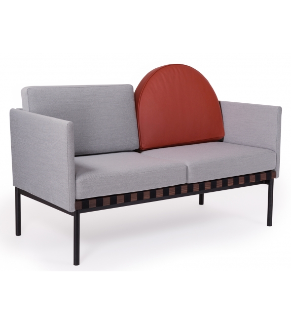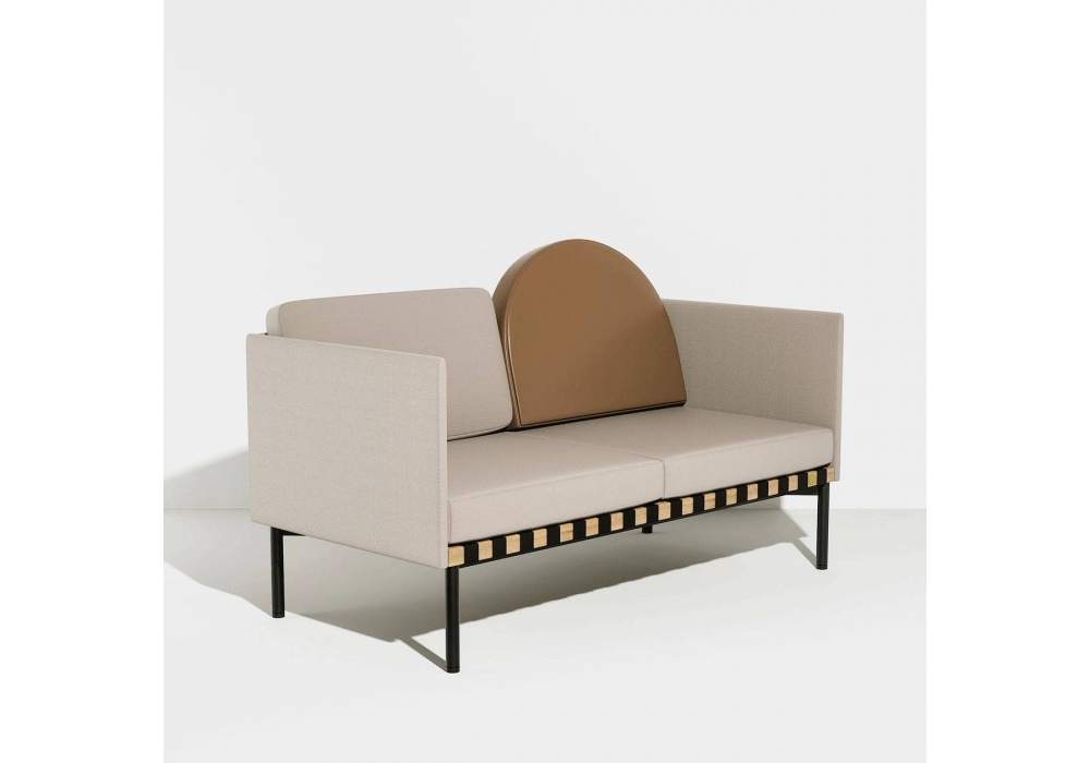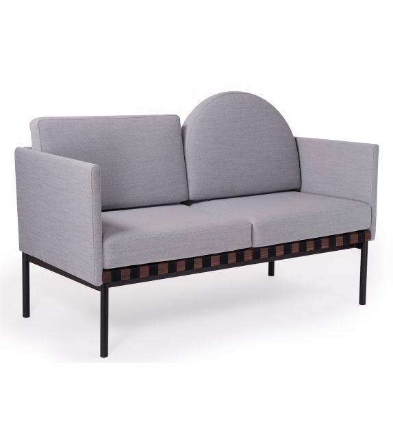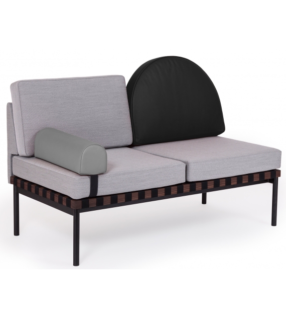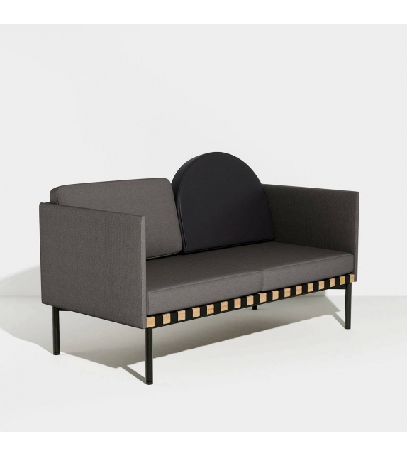 Grid von Pool für Petite Friture entworfen, ist ein Zweisitzer-Sofa mit Holzstruktur und Bezug aus verschiedenen Stoffarten. Verfügbar mit oder ohne Armlehnen, runder Kissenbezug aus Stoff oder Leder.