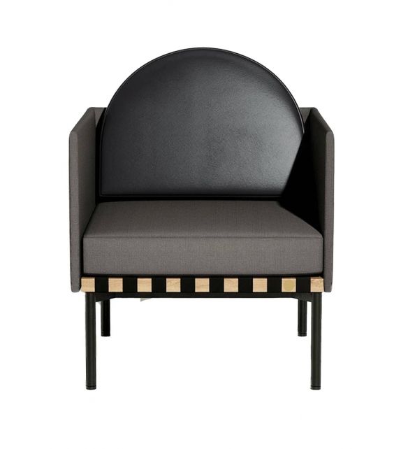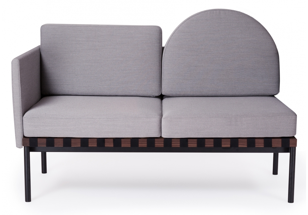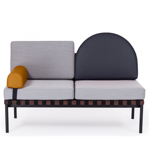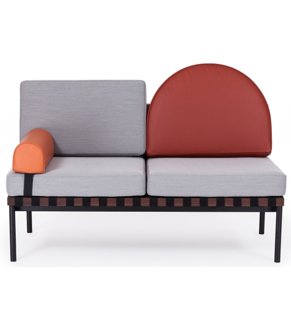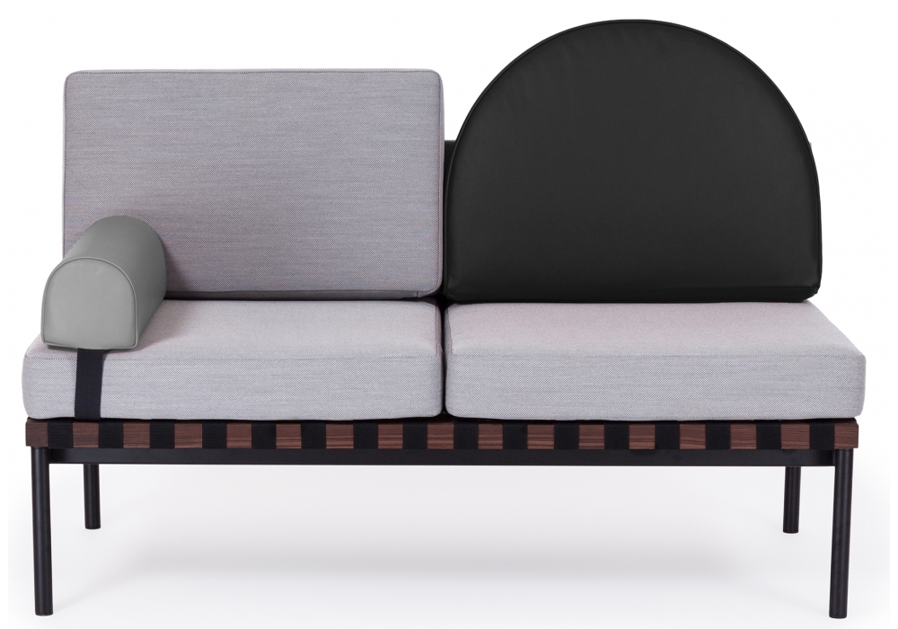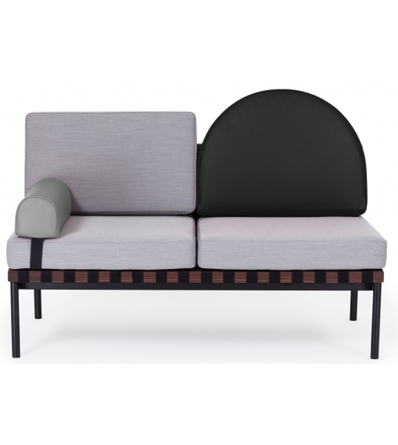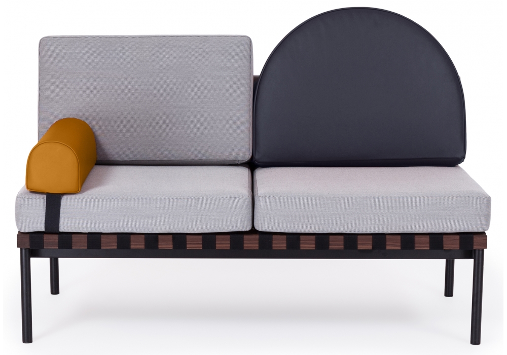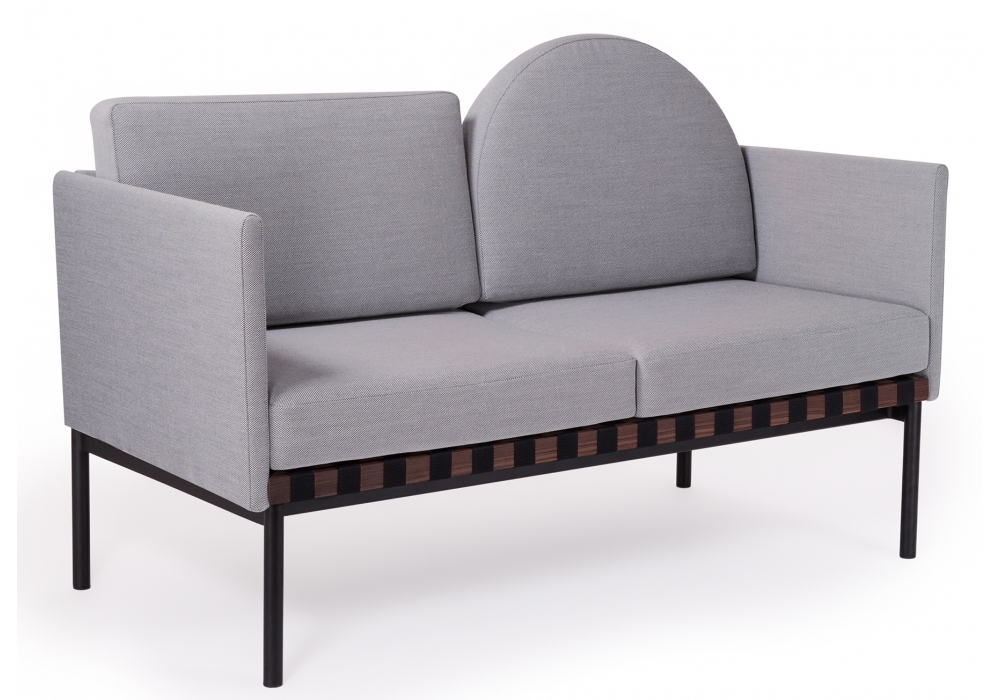 Grid von Pool für Petite Friture entworfen, ist ein Zweisitzer-Sofa mit Holzstruktur und Bezug aus verschiedenen Stoffarten. Verfügbar mit oder ohne Armlehnen, runder Kissenbezug aus Stoff oder Leder.
