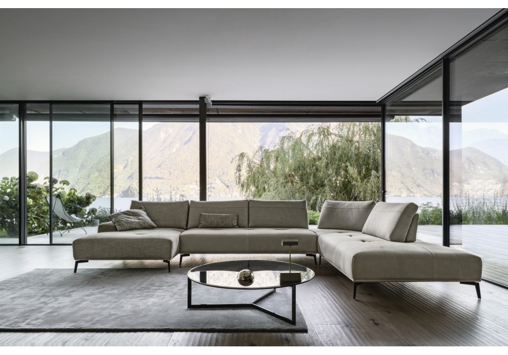 Egeo von Nicoline entworfen, ist ein Sofa mit Struktur aus Holz und Sperrholz mit Metallstütze und Sitz mit elastischen Gurten. Sitzkissen aus ökologischem Polyurethanschaum, Stoff- oder Lederbezug, nicht abnehmbar. Fuß aus poliertem, satiniertem Metall, Rotguss und in RAL-Farben lackiert.