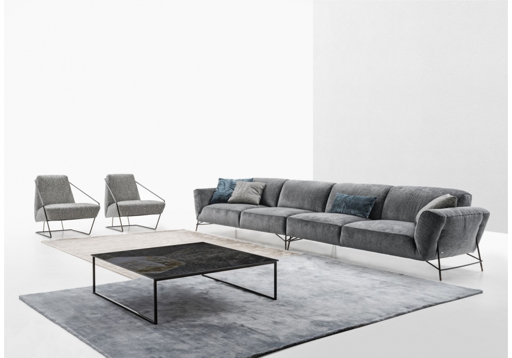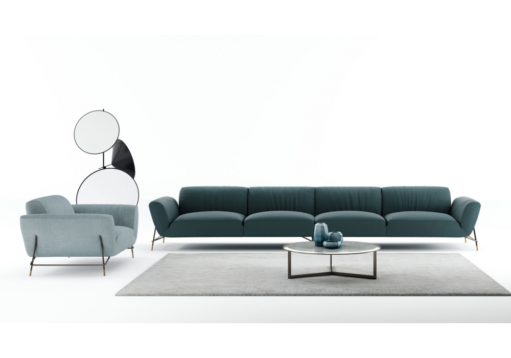 Turro von Nicoline ist ein Sofa mit einer Struktur aus Holz und Sperrholz, das mit elastischen Gürteln gefedert ist. Armlehnenpolsterung aus Polyurethanschaum mit Tecnoform-Bezug, umweltfreundliche Sitzkissen aus Polyurethanschaum mit unterschiedlicher Dichte und Rückenkissen aus Polyurethanschaum mit Federmatratze. Bezug aus Stoff oder Leder, nicht abziehbar. Füße aus Rotguss, Unterseite satiniert.