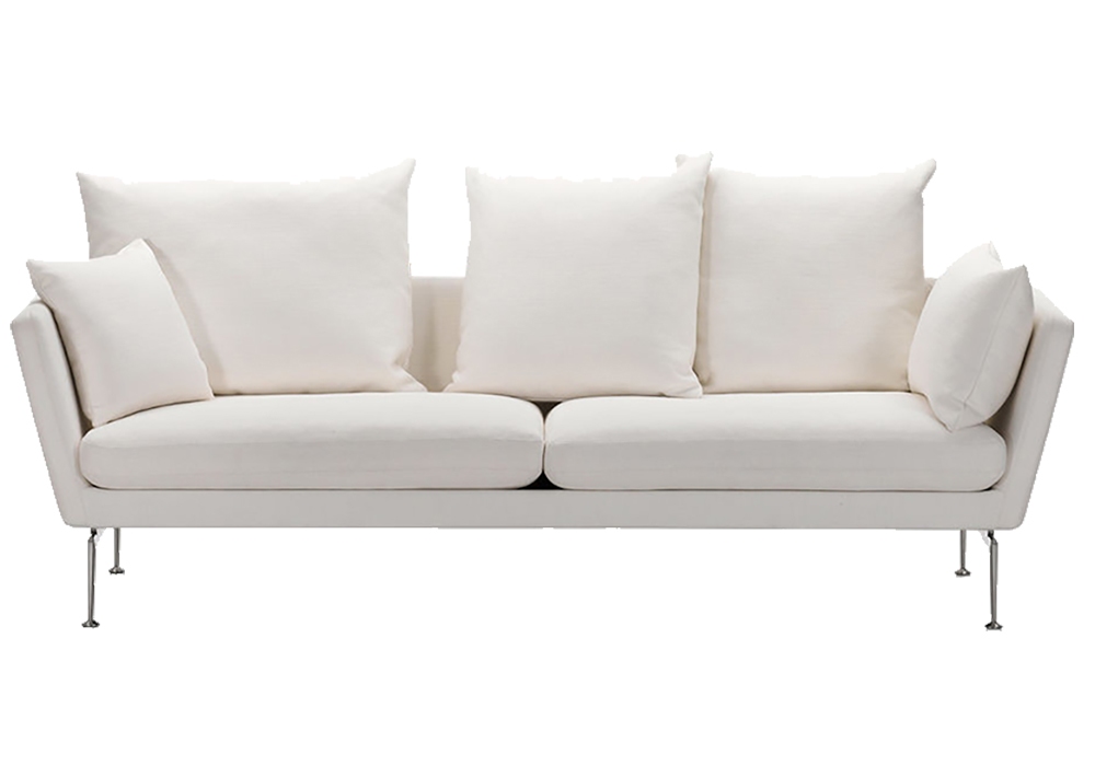 Suita 3 Sitzer von Antonio Citterio für Vitra ist ein 3-Sitzer-Sofa erhältlich mit traditionellen Kissen oder mit spitzen Rückenkissen. Optional das Regal hinten an der Rückenlehne und die hohe Kopfstütze. Das Sofa hat eine Aluminiumdruckgussbasis mit einer glänzenden oder pulverbeschichteten Oberfläche, die Struktur ist mit abnehmbarem Stoff oder Leder bezogen.