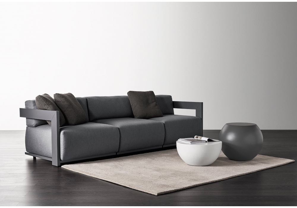 Claud, entworfen von Andrea Parisio für Meridiani, ist ein Sofa in einem Tulpen-Massivholzrahmen, der in verschiedenen matten Lackfarben und Kissen aus Polyurethan und Polyesterfasern ausgeführt ist.