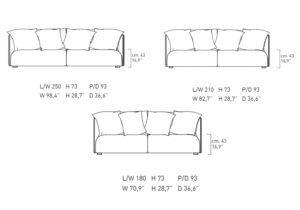 | Abmessungen | 180 x 93 x H 73 cm; 210 x 93 x H 73 cm; 250 x 93 x H 73 cm. |