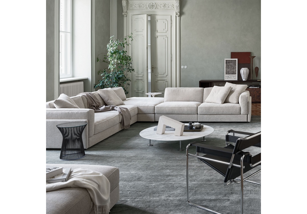 Gould von Piero Lissoni für Knoll entworfen, ist ein Sofasystem. Die Module des Sofas bestehen aus einem Metallrahmen mit angebrachten Polyurethanschaumplatten, die mit Stoff, Leder oder Kastanienholz bezogen sind. Kissen mit variablem Schaumkern, Daunenfüllung und Stoff- oder Lederbezug.