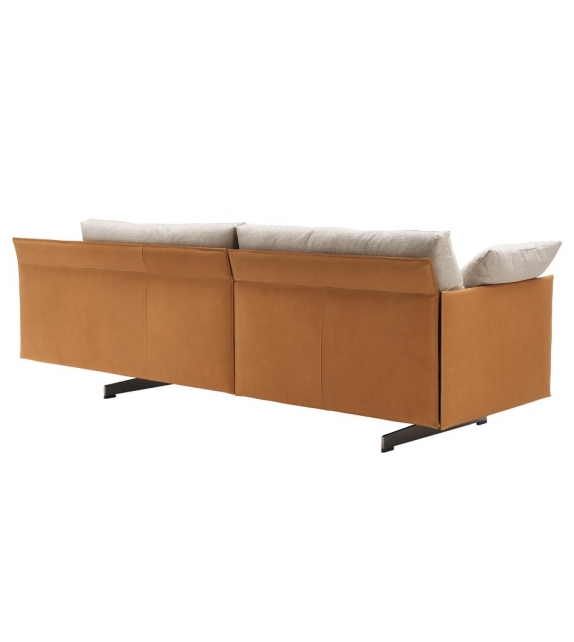 GranTorino Sessel Poltrona Frau: Wo sich das zugeschnittene und von Hand geformte Leder den Linien und Formen des Sessels anpasst und sie hervorhebt. Komplex und exakt auch die Bearbeitung der hohen, schlanken Armlehne und der niedrigen Armlehne, auch in der Ausführung als Behälter erhältlich, der im Innern ein elegantes Tablett in Eiche natur verbirgt. Die Kissen sind in der Mitte mit horizontalen Nähten verziert, die dem Sofa ein leichtes Aussehen verleihen. Kompakte, ausgewogenen Volumen, um den Raumbedarf möglichst klein zu halten, bequeme Sitzflächen. Das Gestell von GranTorino besteht aus Metallrohren mit elastischen Flechtgurten. Die Rücken- und Armlehnen bestehen aus einem Multischichtpaneel in Birke und Pappel. Die Polsterung ist aus PUR-Schaum mit differenzierter Dichte und Pressfilz. Die Kissenpolsterung der Rückenlehne besteht aus getrennten horizontalen Daunenkammern, um einen differenzierten und anatomischen Komfort zu erhalten. Die Füße sind aus titanfarben lackiertem Aluminium.