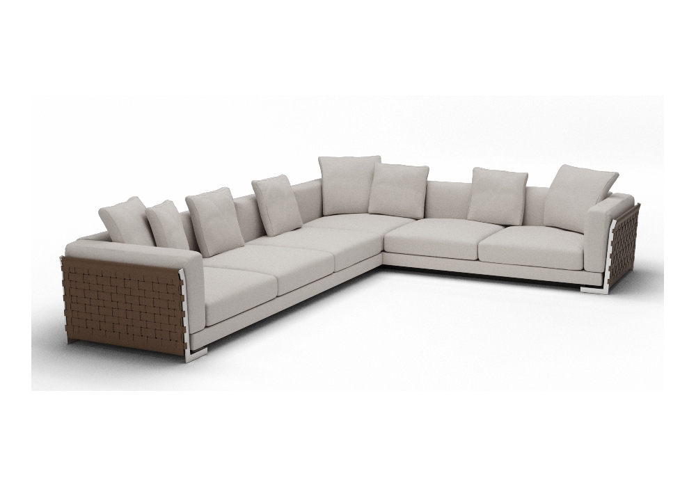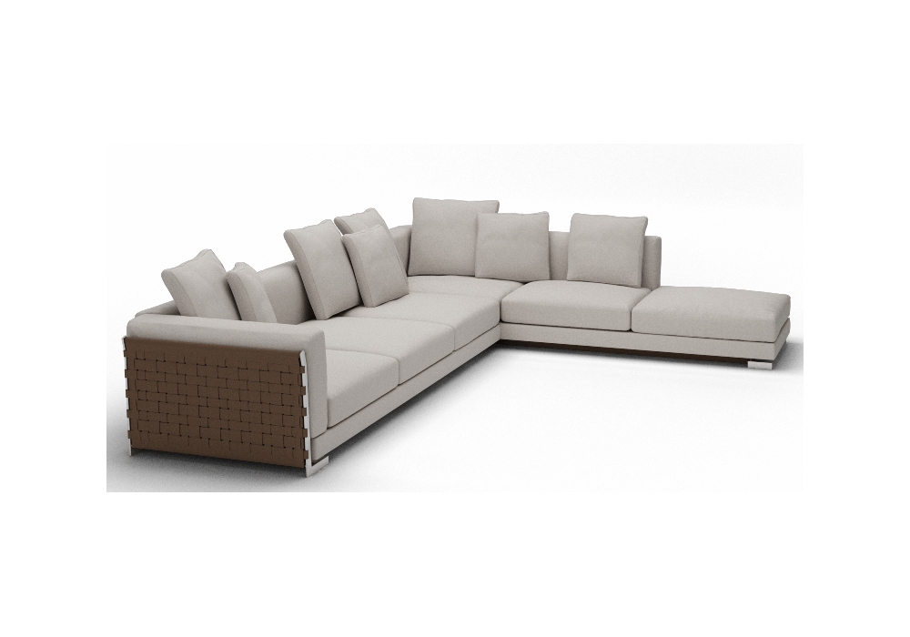 Cestone 09 von Antonio Citterio für Flexform entworfen, ist ein modulares Sofa mit Rückenlehnen und Seiten aus Metallrahmen, die mit gewebtem Lederleder bezogen sind, und einem Sitz aus Metall und Massivholz mit Polyurethanschaumpolsterung. Rücken-, Sitz- und Armlehnenkissen sind mit Gänse gepolstert und mit Leder oder Stoff bezogen. Das Cestone 09-Sofa unterscheidet sich von Cestone durch die größere Tiefe des Sitzes. Das Sofa ist in verschiedenen Konfigurationen erhältlich.