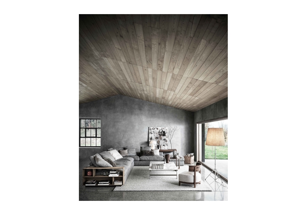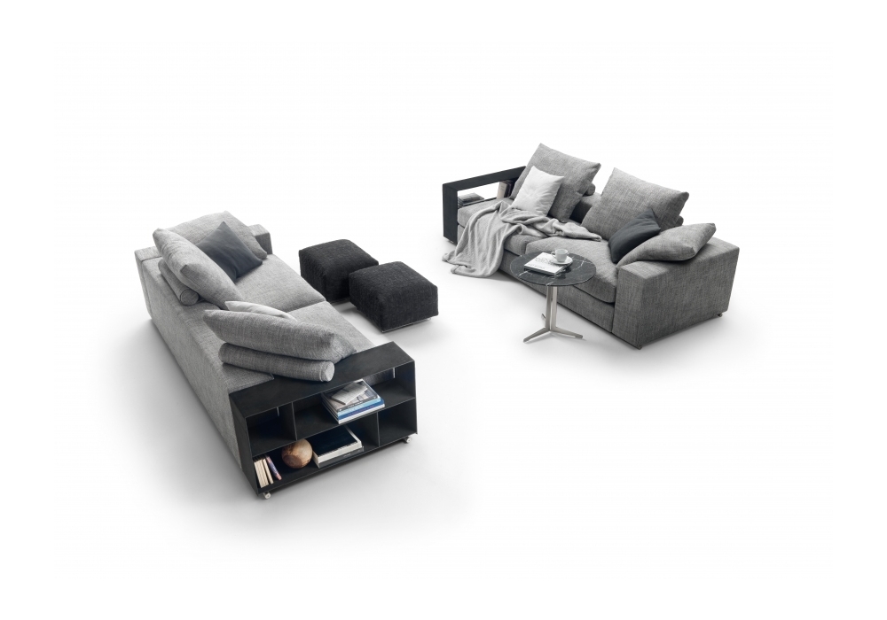 Groundpiece von Antonio Citterio für Flexform entworfen, ist ein modulares Sofa mit einer Metallstruktur, die mit Polyurethan, Metallfüßen und einer mit Leder bezogenen Metallbehälterarmlehne gepolstert ist. Das Sofa ist in verschiedenen Konfigurationen erhältlich und mit Leder oder Stoff bezogen.