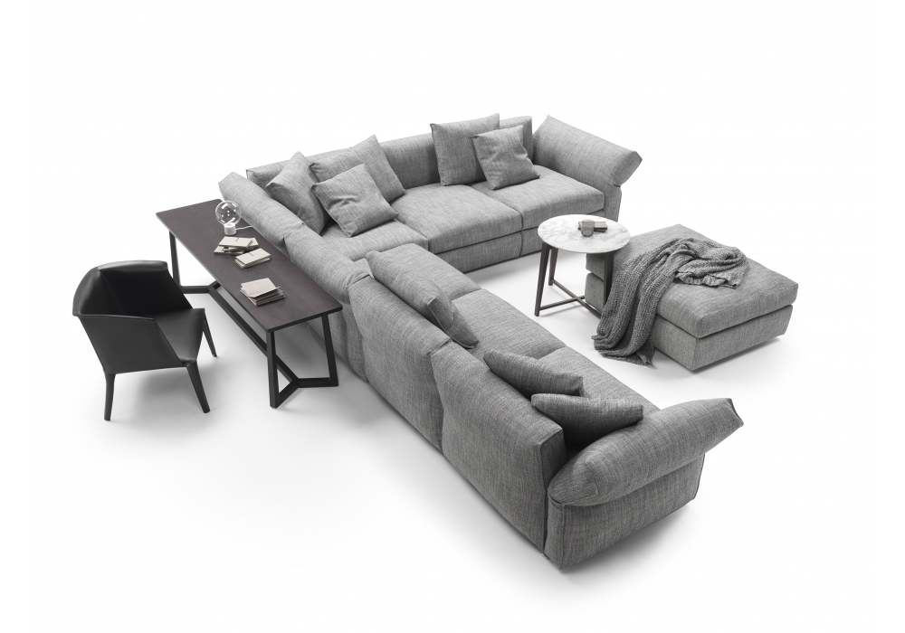 Newbridge von Carlo Colombo für Flexform entworfen, ist ein modulares Sofa, das aus Modulen besteht, die mit Sitzkissen aus nicht verformbarem Material oder Polyurethanschaum und Polyesterfaser und Gänsedaunen gepolstert sind; mit Polyurethan gepolsterte Metallstruktur; Rücken- und Armlehne mit Metallknopf und Metallfüßen. Das Sofa ist mit Stoff oder Leder bezogen.