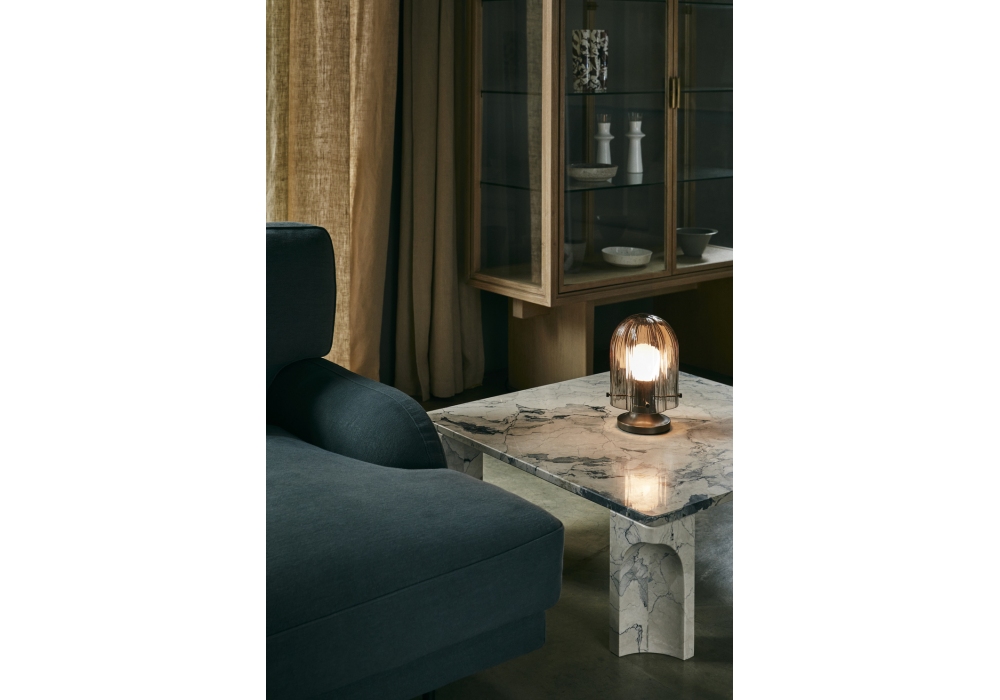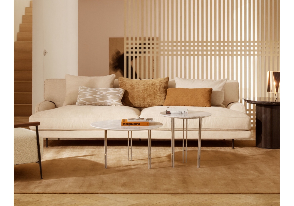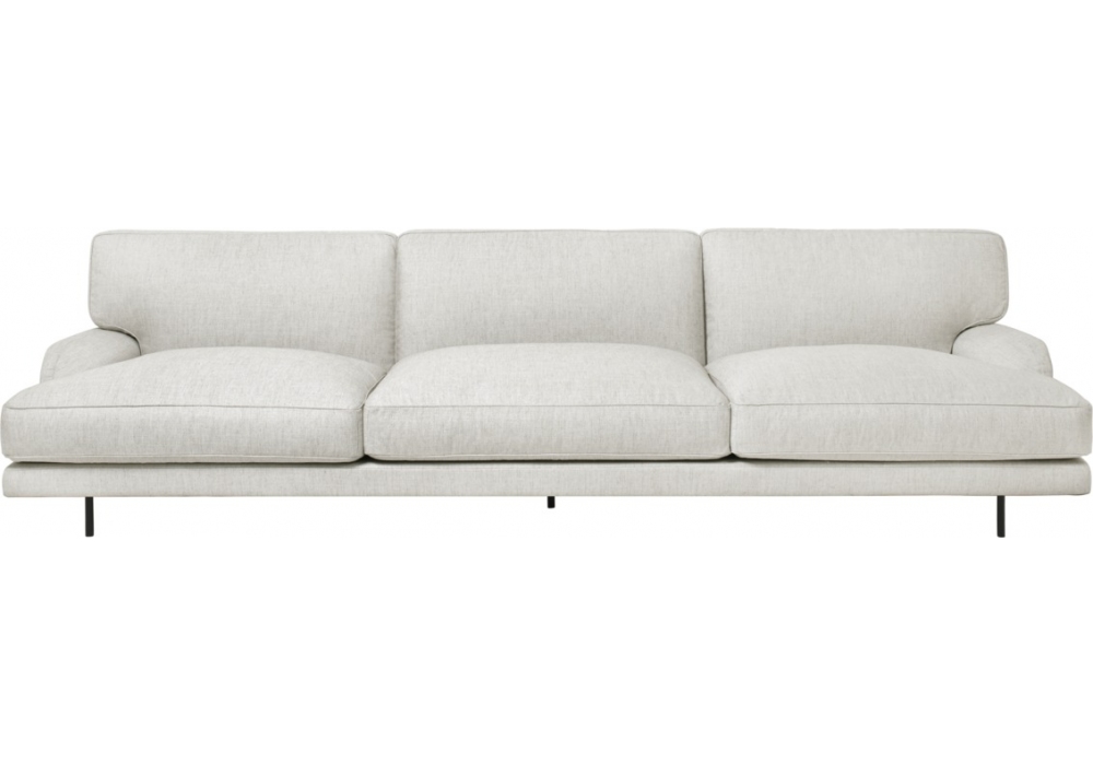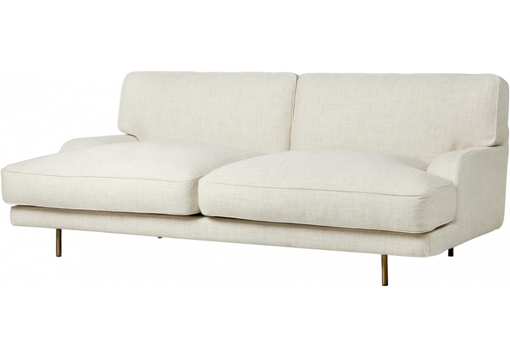 Flaneur von GamFratesi für Gubi entworfen, ist ein Sofa verfügbar mit Stoff- oder Lederbezug und schwarz matt oder antik messing lackiertem Gestell.