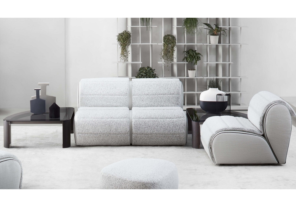 Flora von Ilenia Viscardi für Flou entworfen, ist ein Sofa mit gepolsterter Struktur und Bezug aus Stoff oder Leder. Optional abnehmbarer "Mantel", im gleichen Stoff- oder Lederbezug oder in Kontrastfarbe. Er wird mit Klettverschluss im mittleren und unteren Bereich der Sitzfläche und mit einem Gegengewicht im hinteren Bereich der Rückenlehne befestigt.
