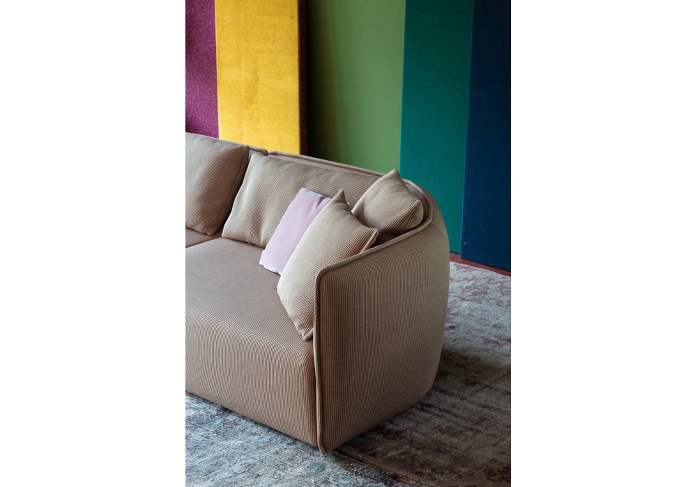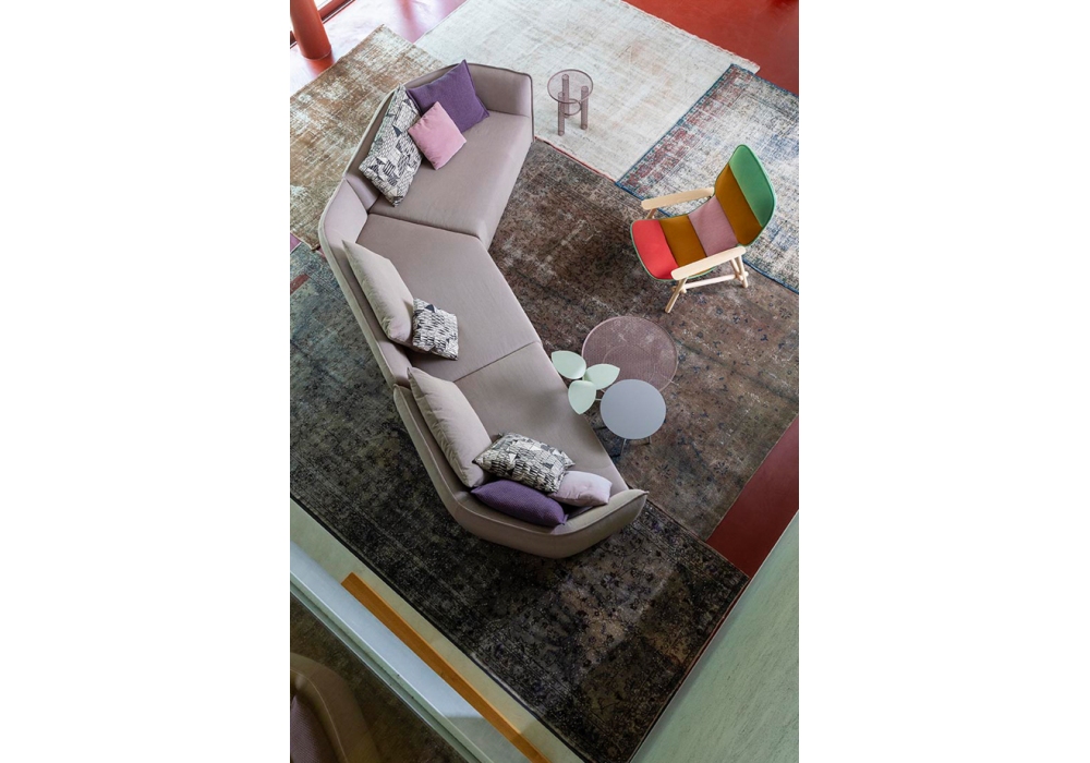 Chamfer von Patricia Urquiola für Moroso entworfen, ist ein modulares Sofa bestehend aus Sitzelementen mit strapazierfähigem Polyurethanschaum in unterschiedlichen Dichten und Polyesterfasern auf Holzrahmen. Endteile der Seiten sind eingespritzter flammhemmender Polyurethanschaum. Die Abdeckungen der Fasensammlung sind abnehmbar.