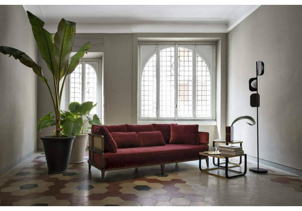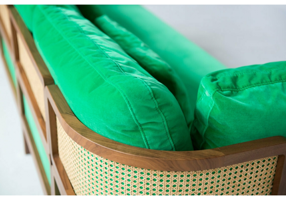 Promenade von Philippe Nigro für Gebrüder Thonet Vienna entworfen, ist ein Sofa mit abnehmbarem Bezug. Struktur mit Profilen aus Nussbaum Canaletto und mit Stoff bezogenen Paneelen. Sitz und Kissen gepolstert mit Polyurethanschaum und Gänsefedern oder Polyester mit Stoff- oder Lederbezug. Oberband erhältlich in Wiener Stroh oder mit Polsterung in der gleichen Ausführung wie die Sitzfläche. Das Sofa ist auch in zwei Größen erhältlich.