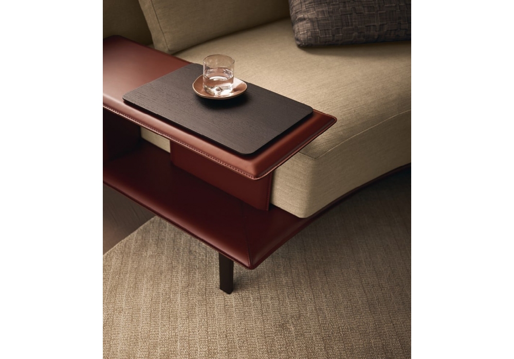 Brera von Jean-Marie Massaud für Poliform entworfen, ist ein modulares Sofa mit Metallbasis und Bezug aus Stoff oder Leder. Regal und Slim-Armlehne mit Bezug aus Leder, optionales Tablett aus schwarzer Ulme. Verfügbar in verschiedenen Konfigurationen.
