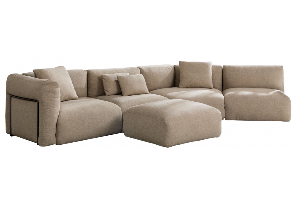 Fiocco, entworfen von Pinuccio Borgonovo für Flou, ist ein modulares Sofa, das aufgrund der sieben Elemente, darunter zwei Chaiselongue-Module und ein fünfeckiges Modul, in verschiedenen Konfigurationen erhältlich ist. Die Kissen können als Rücken- oder Armlehne verwendet werden und sind in zwei Höhen erhältlich. Sie sind mit einem gebogenen U-förmigen Metallstab an den Sockeln verankert.