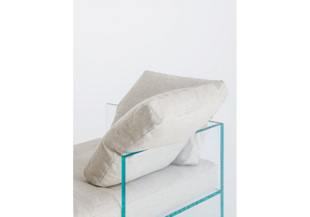 Tête-à-Tête von Piero Lissoni für Glas Italia entworfen, ist ein Sofa mit Struktur aus transparentem Extralight mm 19 geformt, gehärtet und mit UV-Klebung zusammengefügt Die Struktur ist mit weichen Kissen bezogen, abnehmbar und in verschiedenen Stoffen oder Kunstleder erhältlich. verschiedenen Farben Die Polsterung besteht aus hypoallergenem, tierversuchsfreiem und umweltfreundlichem Material, das durch Recycling von Kunststoffen gewonnen wird, die aus den Ozeanen gesammelt werden Zwei Versionen sind erhältlich: eine mit einem in den Sitz integrierten Beistelltisch (rechts oder links), die andere mit doppelter gegenüberliegender Sitz.