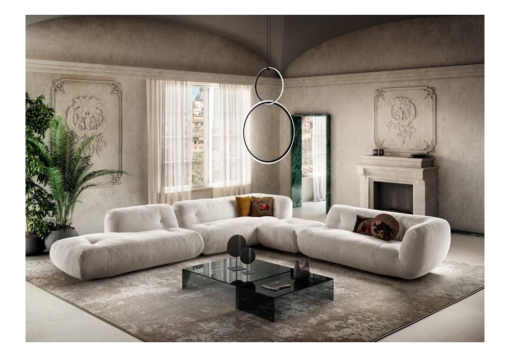 Happening disegnato da Mauro Lipari für Lago ist ein Sofa, das aus verschiedenen Elementen entsteht, die kombiniert werden können: lineare Sofas, Seitensofas, Halbinseln, Trapeze und Chaiselongues.