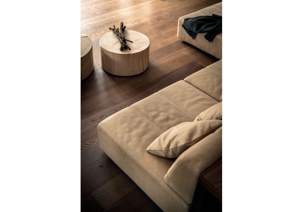 Fur Nature von Jamie Durie für Riva 1920 entworfen, ist ein gepolstertes Sofa mit Leder- oder Stoffbezug mit sichtbaren Nähten, ausgestattet mit einer Rückenlehne aus furnierter Tischlerplatte. Es zeichnet sich durch große Vielseitigkeit dank modularer Module aus, die unterschiedliche Lösungen ermöglichen.