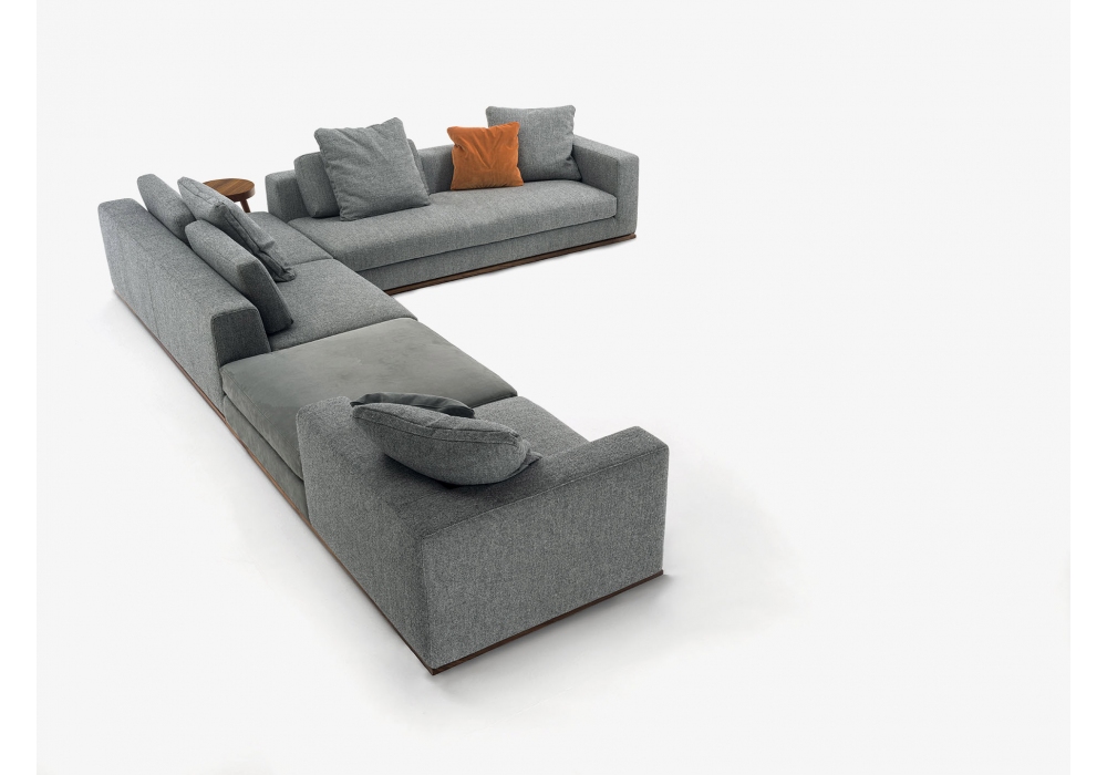 Heritage von Gabriele & Giuliano Cappelletti für Riva 1920 entworfen, ist ein modulares Sofa aus einem Massivholzboden in Kombination mit Leder- oder Stoffkissen, die sich durch sichtbare Nähte auszeichnen.