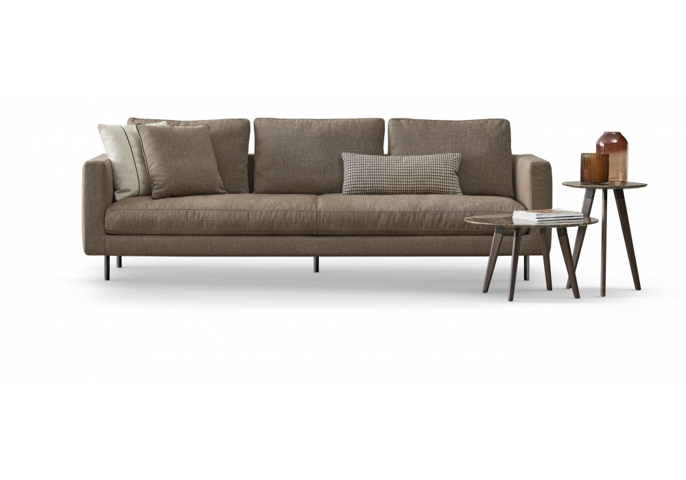 Easy von Carlo Bimbi für Dema entworfen, ist ein Sofa mit interner Struktur aus massiver Tanne, Sitzkissen aus Polyurethanschaum mit mehreren Dichten und Steppdecke aus kanalisierten Gänsedaunen. Füße aus lackiertem Metall RAL 8022 und Bezug aus Stoff oder Leder.