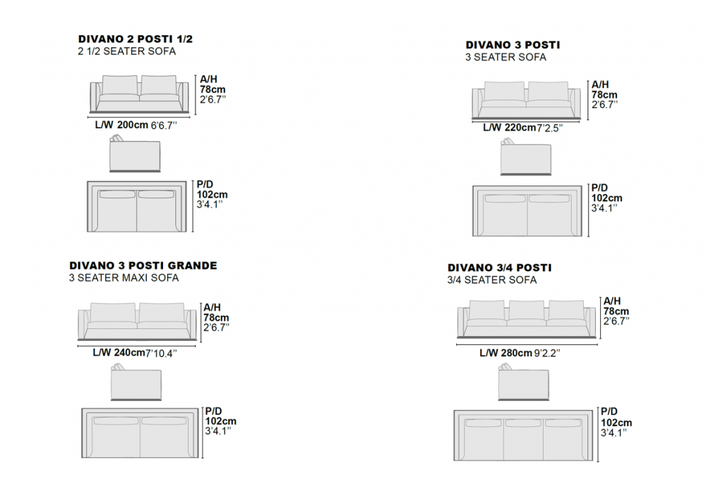 | Abmessungen | - 200 x 102 x H 78 cm; - 220 x 102 x H 78 cm; - 240 x 102 x H 78 cm; - 280 x 102 x H 78 cm. |