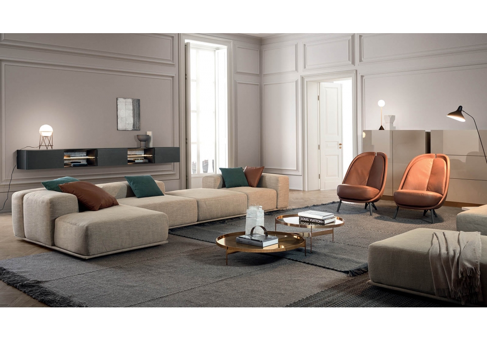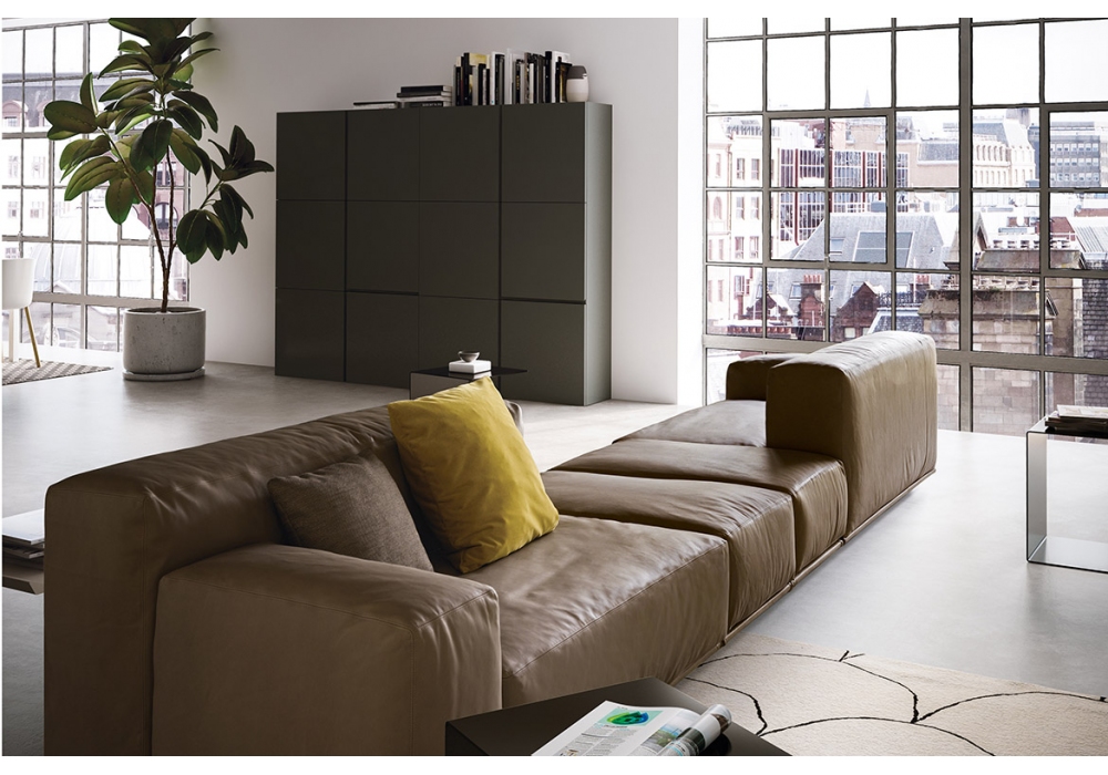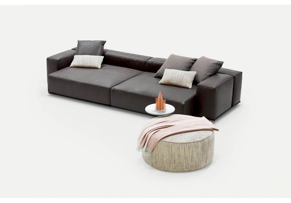 Delano von Pianca entworfen, ist ein modulares Sofa mit einer Plattform aus Sperrholz, die mit Samtfutter in Verbindung mit Gummi überzogen ist, Sitzkissen aus Polyurethanschaum mit unterschiedlicher Dichte und einem Sitzbereich aus kanalisierten weißen Daunen. Bezug aus abziehbarem Stoff oder aus nicht abziehbarem Leder oder Kunstleder. Füße aus schwarzem Nylon.