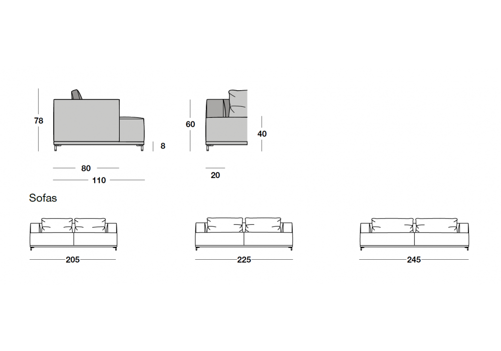 | Abmessungen | - 205 x 110 x H 78 cm; - 225 x 110 x H 78 cm; - 245 x 110 x H 78 cm. |