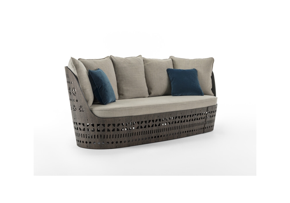 Dogon S, von Ferruccio Laviani für Emmemobili entworfen, ist ein Sofa, das sich durch eine perforierte Struktur aus einer einzigen flexiblen Platte aus furniertem gebogenem Sperrholz auszeichnet. Sitzkissen mit Schaumstoffpolsterung bezogen mit Samt oder Stoff. Auf Wunsch sind Rückenkissen mit samt- oder stoffbezogener Federpolsterung erhältlich.