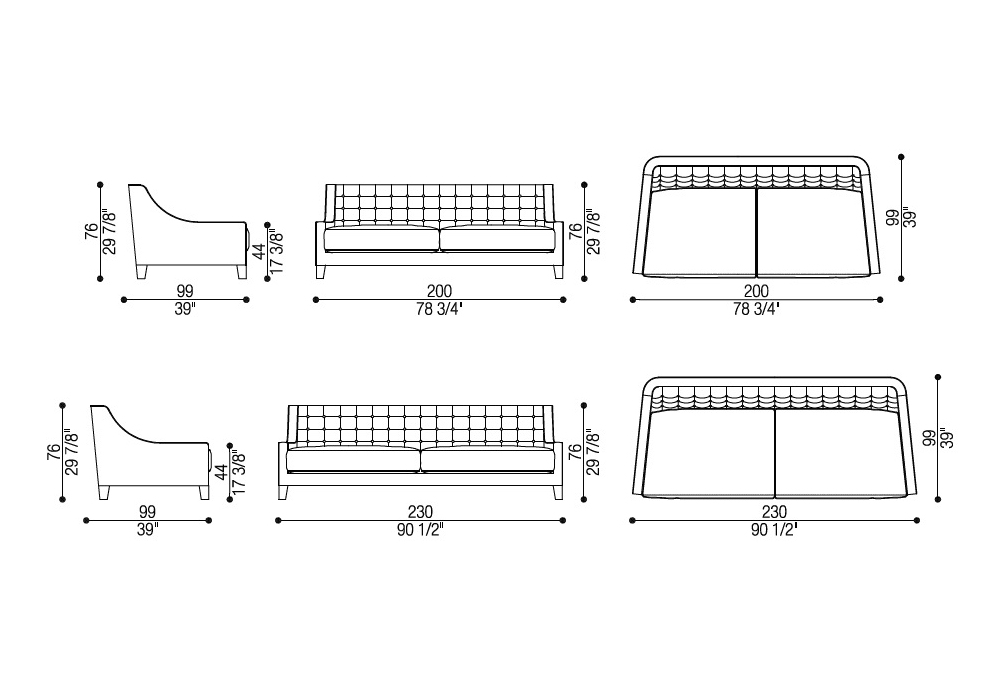 Rosalie Classic von Castello Lagravinese Studio für Opera Contemporary entworfen, ist ein Sofa mit Federpolsterung mit Polyurethanschaumeinlage, Holzsockel und nicht abnehmbarer Bezug aus Leder oder Stoff. Verfügbar in 2 Abmessungen.