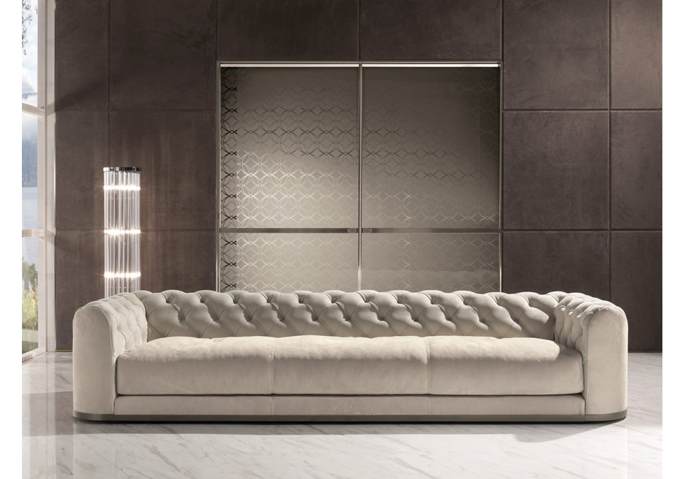 Milton von Giuseppe Iasparra für Longhi entworfen, ist ein modulares Sofa mit Holzstruktur mit elastischen Riemen, die mit hochdichtem Polyurethanschaum überzogen sind. Rückenlehne und Teil der Armlehne mit „Capitonné“-Handwerkskunst mit einfarbigen Knöpfen oder mit „Swarovski“-Kristallen bedeckt. Metallsockel in verschiedenen Ausführungen.