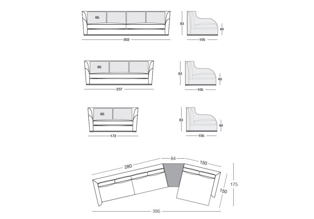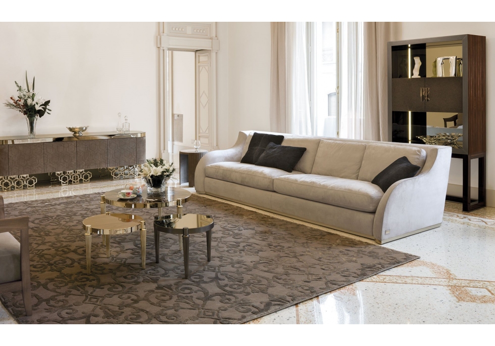 Rey von Giuseppe Iasparra für Longhi entworfen, ist ein modulares Sofa mit Holzstruktur mit elastischen Riemen, bezogen mit hochdichtem Polyurethanschaum. Rückenkissen aus sterilisierter Gänsedaune mit Einlage aus Polyurethanschaum mittlerer Dichte und Sitzkissen aus Polyurethanschaum dreifacher Dichte, bezogen mit sterilisierter Gänsedaune und gestützt durch eine Polsterung aus Memory Foam. Basis aus verchromtem Metall und Polsterung aus Stoff oder Leder. Auf Anfrage ist es möglich, einen Teilungstisch hinzuzufügen.