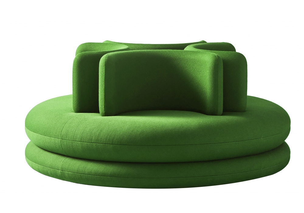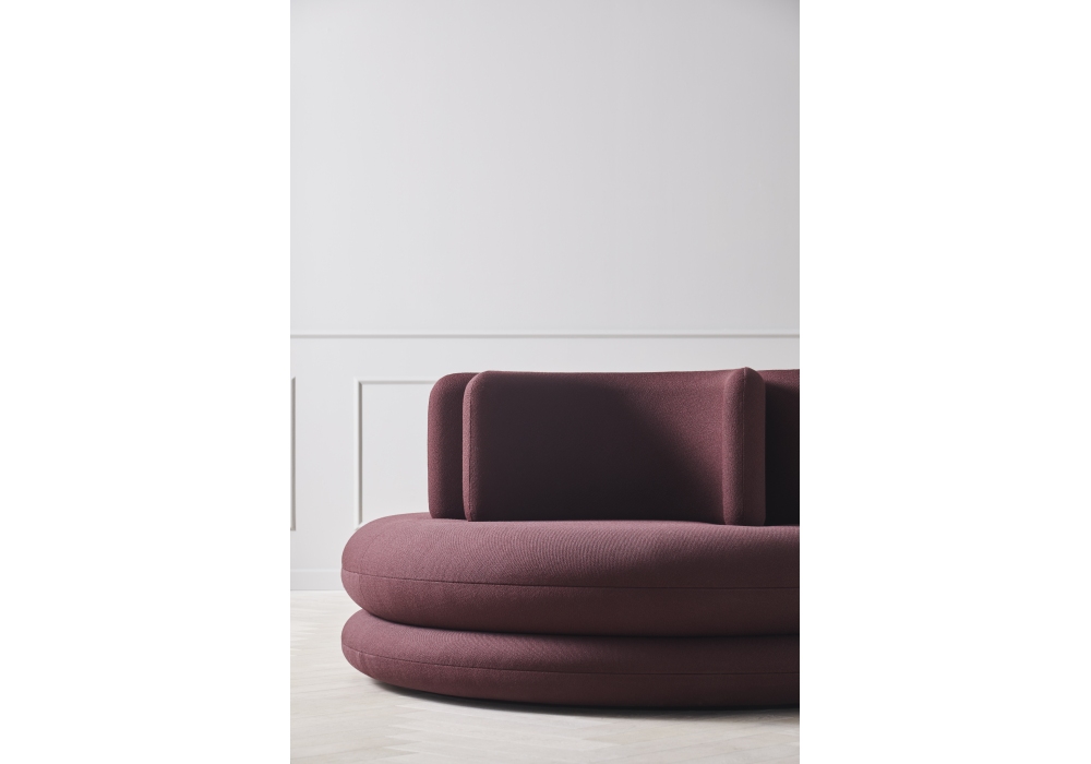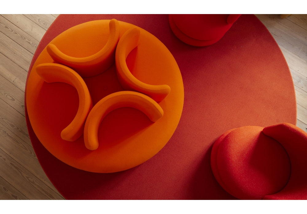 Easy Sofa von Verner Panton für Verpan entworfen, ist ein U-förmiges Sofa mit vier Rückenlehnen und schwarzem MDF-Fuß mit Filzgleitern. Struktur aus FSC- und TSCA-zertifiziertem CMHR-Schaumsperrholz mit Polsterung aus verschiedenen Stoffen. Die Rückenlehnen dienen gleichzeitig als Armlehnen.