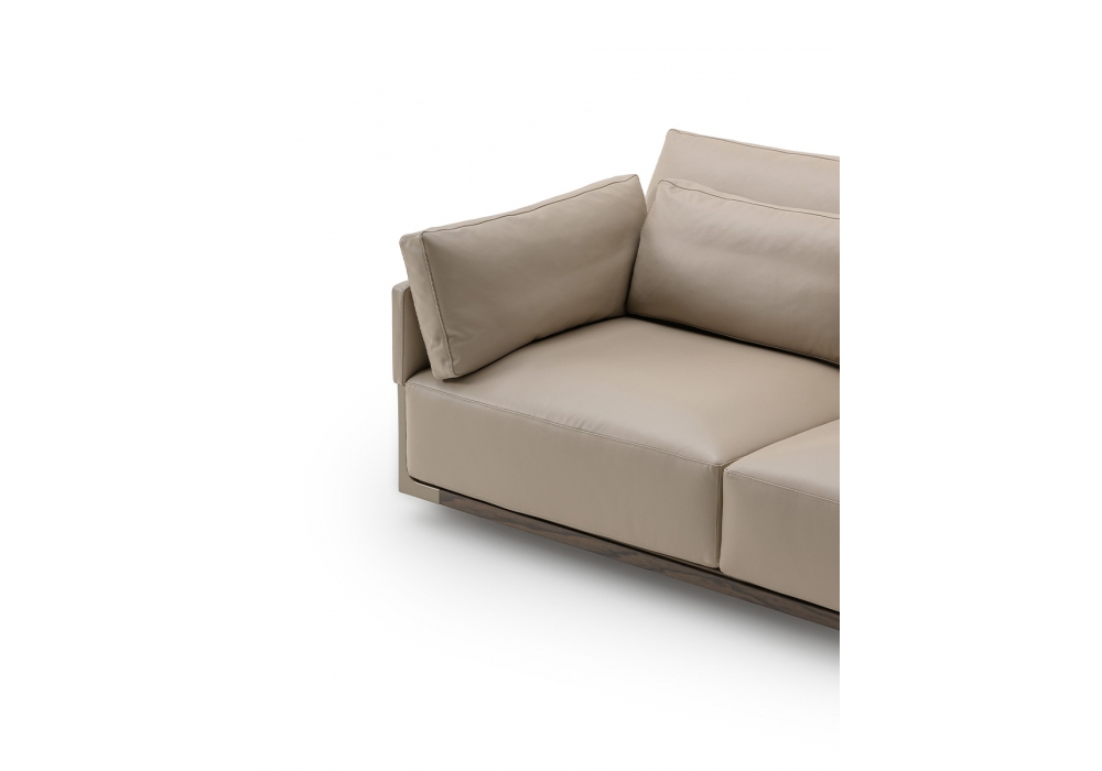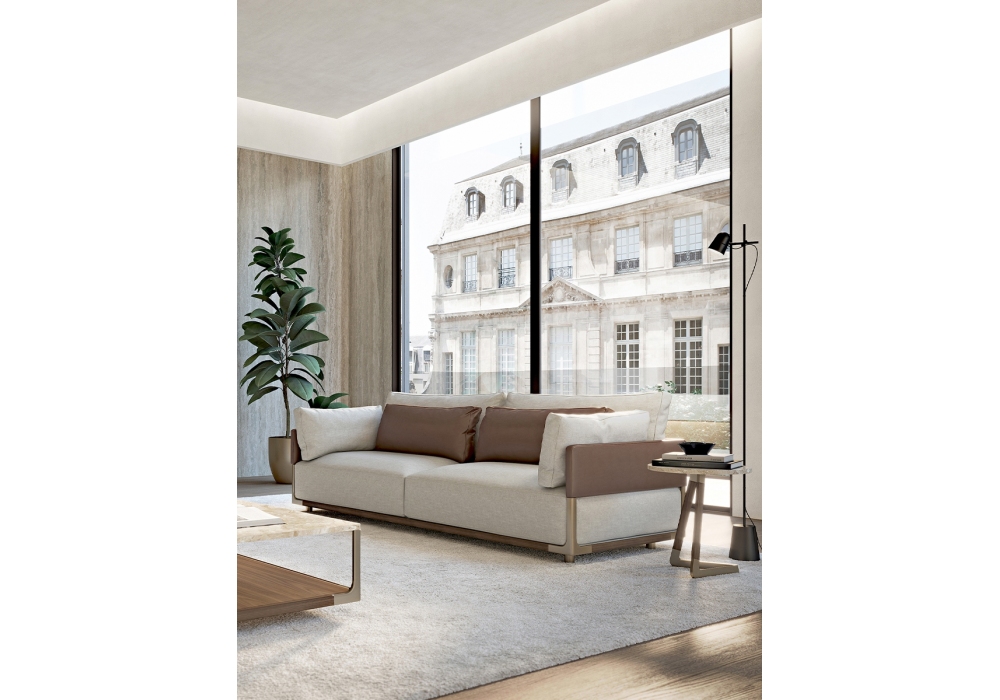 Drum von Giuseppe Viganò für Turri entworfen, ist ein Sofa mit Struktur aus Metallrohren und -profilen und Bezug aus verschiedenen Ledern oder Stoffen. Auf Wunsch ist es möglich, die Seitenteile mit kontrastierenden glatten oder gewebten Ledern zu individualisieren.