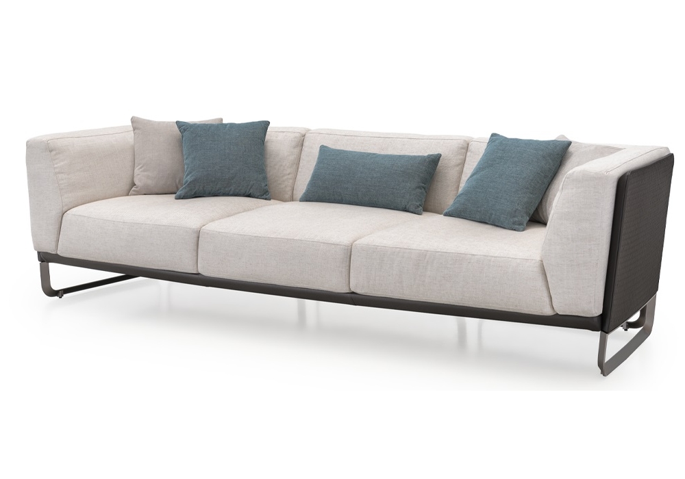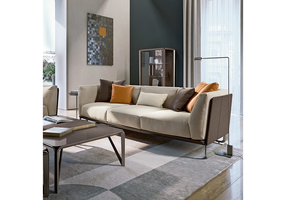 Milano von Blengini Ghirardelli für Turri entworfen, ist ein Sofa mit Struktur aus MDF, Sperrholz und Massivholz, gepolstert mit Polyurethanschaum unterschiedlicher Dichte. Korpus und Kissen mit verschiedenen Ledern oder Stoffen bezogen. Die Füße bestehen aus Metall in gebürstetem Nickel-Finish mit Füßen aus Kunststoff. Verfügbar in der Version mit glatter oder gewebter Schale.