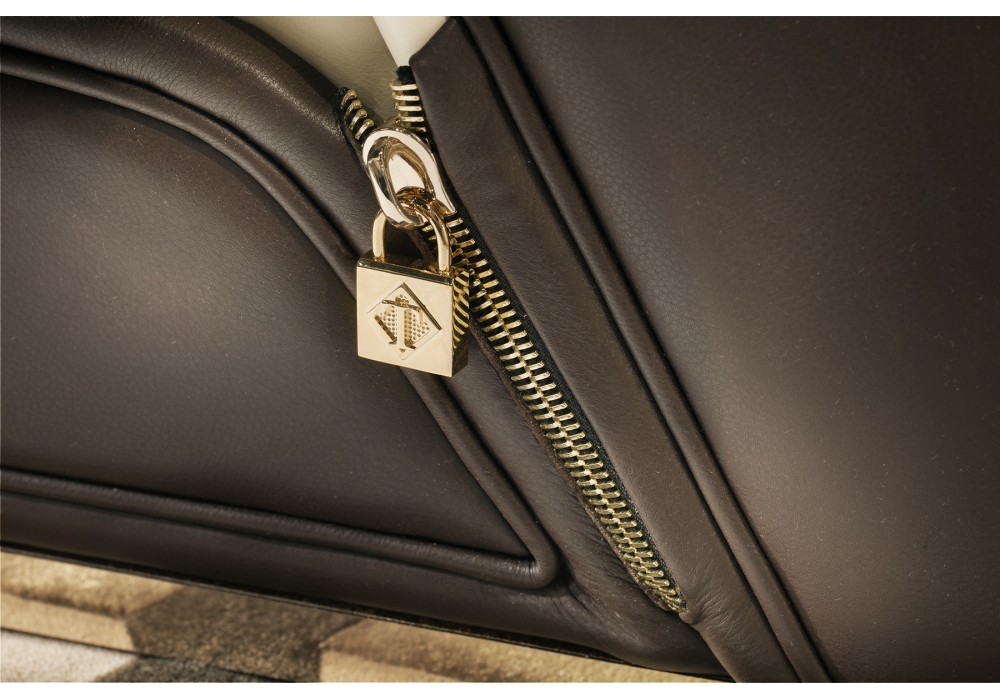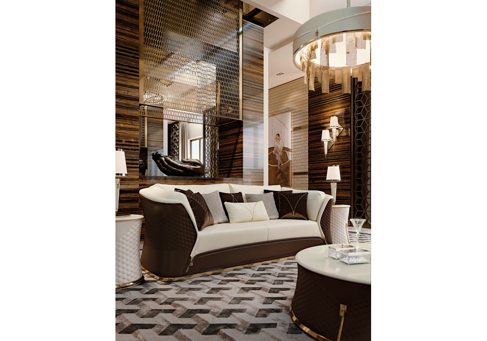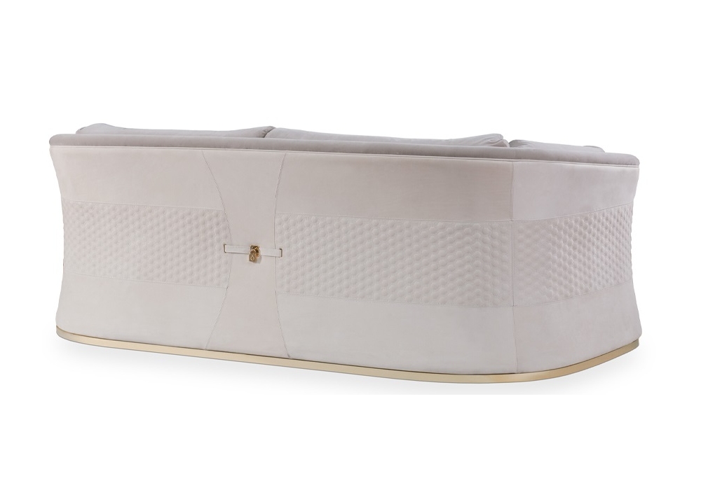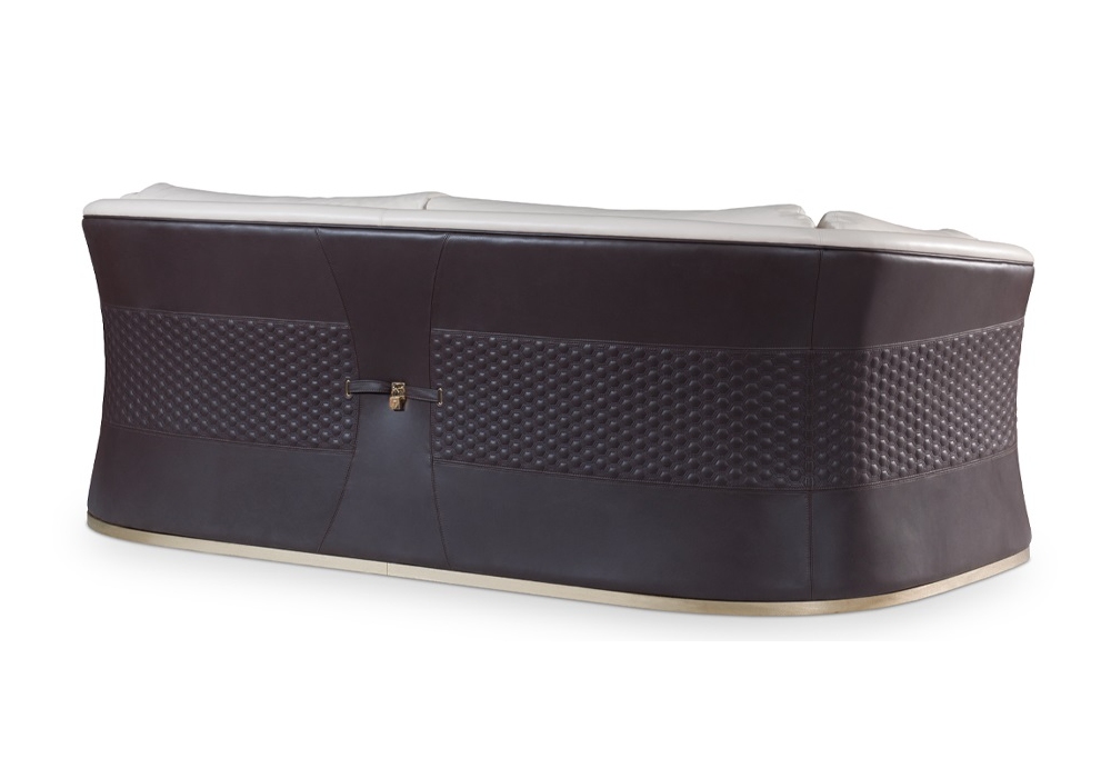 Vogue von Andrea Bonini für Turri entworfen, ist ein Zwei- oder Dreisitzer-Sofa mit einer Struktur aus Massivholz und Sperrholz, die mit Polyurethanschaum mit mehreren Dichten gepolstert ist. Schale aus Leder mit Hexagon-Stickerei und Kissen aus verschiedenen Ledern oder Stoffen. Basis und dekorative Details aus goldenem Metall. Verfügbar in zwei Dimensionen.