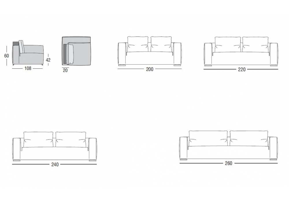 | Abmessungen | - 200 x 108 x H 60 cm; - 220 x 108 x H 60 cm; - 240 x 108 x H 60 cm; - 260 x 108 x H 60 cm. |