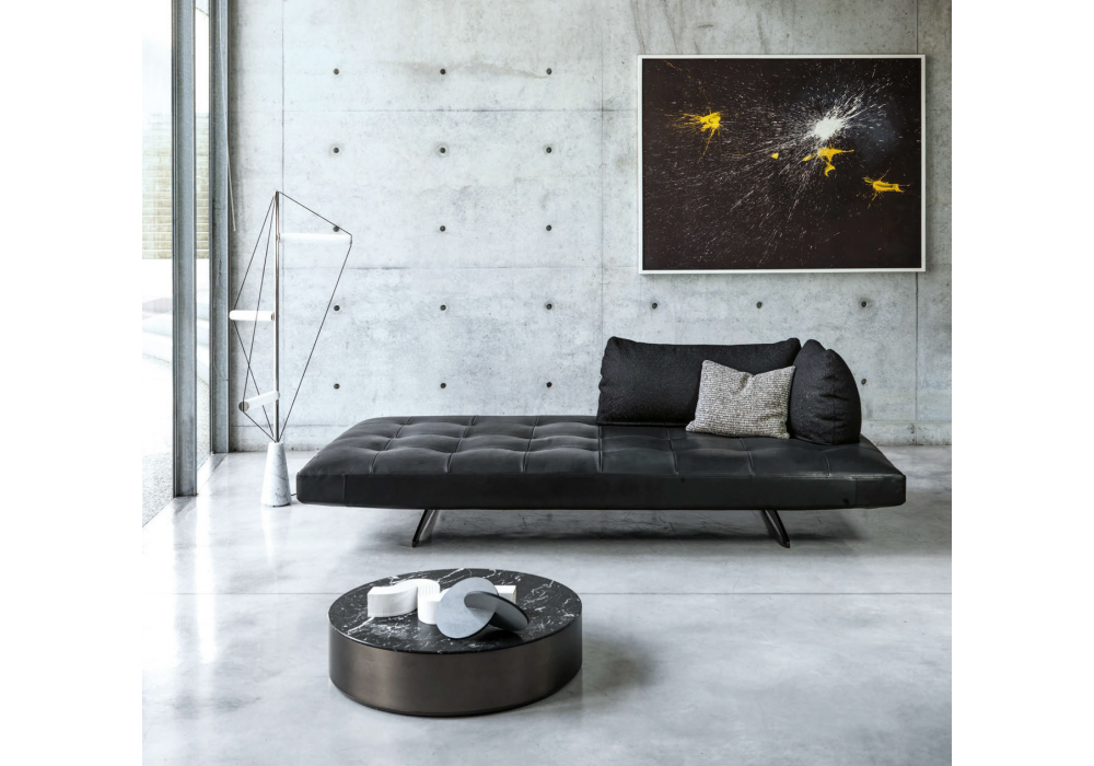 Lovely Day von Marc Sadler für Désirée entworfen, ist ein modulares Sofa mit Struktur aus Metall und Holz, Polsterung aus Polyurethanschaum und abnehmbarem Bezug aus Stoff oder Leder. Der Sockel besteht aus matt bronzefarben lackiertem Metall. Die Rückenlehnen sind selbsttragend, beweglich und können frei positioniert werden.