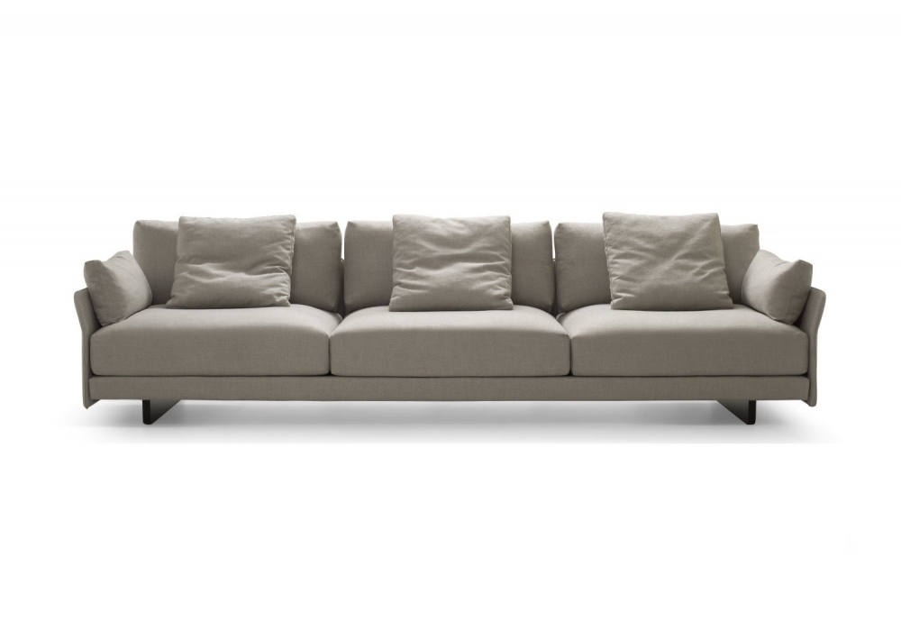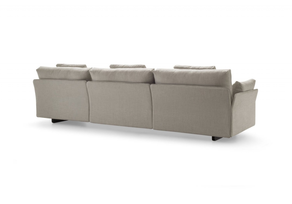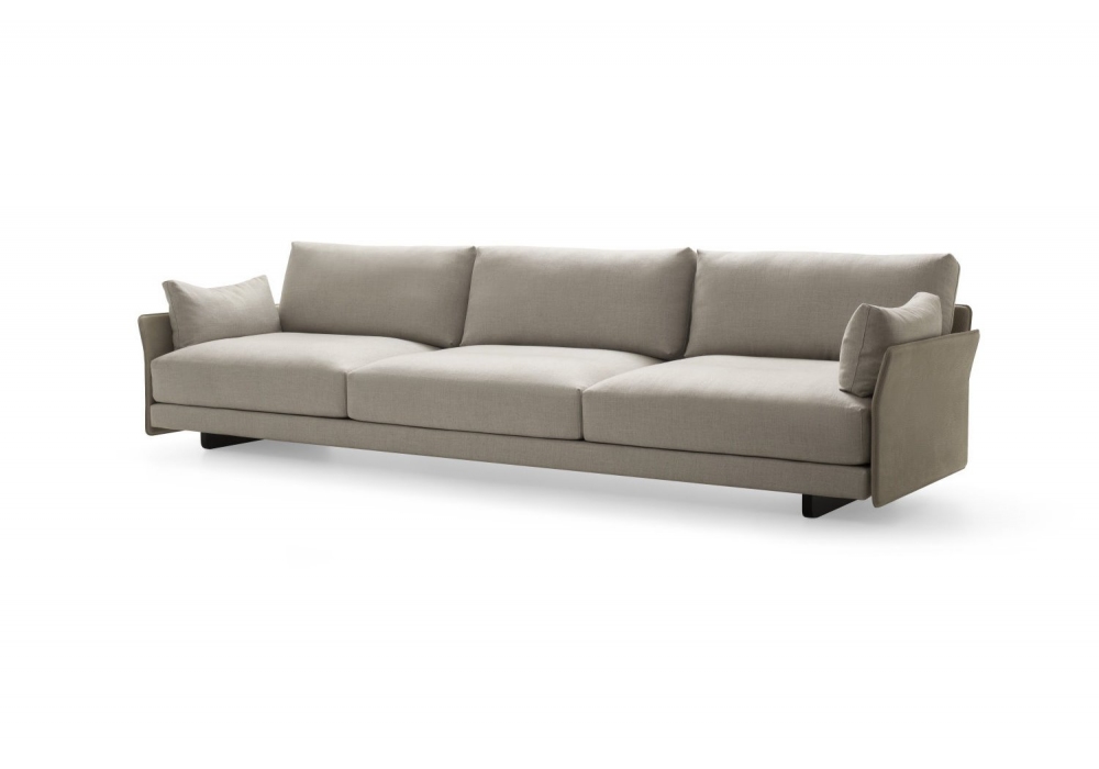 Murphy von Umberto Asnago für Bodema entworfen, ist ein modulares Sofa mit schmalen Armlehnen und schlanken Rückenlehnen aus Leder oder Stoff, Gänsedaunenkissen und hohen Füßen aus schwarzem MDF. Anpassbar hinsichtlich Polsterung und Abmessungen, kann es in linearen Eckmodellen, mit Chaiselongue oder Endhocker konfiguriert werden.
