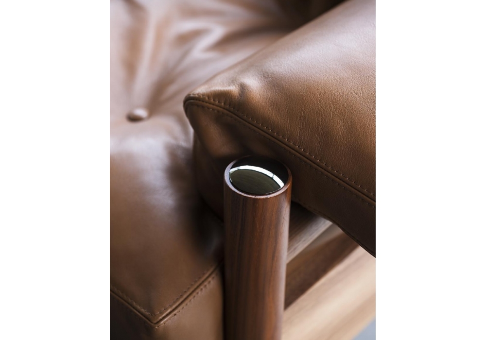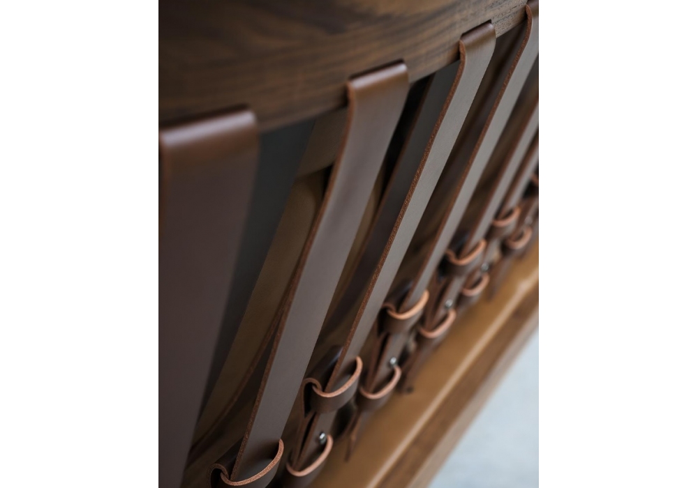 Sella von Carlo De Carli für Tacchini entworfen, ist ein Sofa mit Struktur aus Canaletto-Nussbaum mit Ledergurten. Federkissenpolsterung für den Sitz, Federkissen mit Gummieinlage für die Rückenlehne zur Unterstützung. Metalldetails in glänzendem Schwarzchrom-Finish. Polsterung aus Stoff oder Leder (nicht abnehmbar).