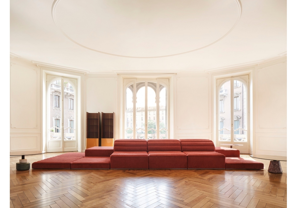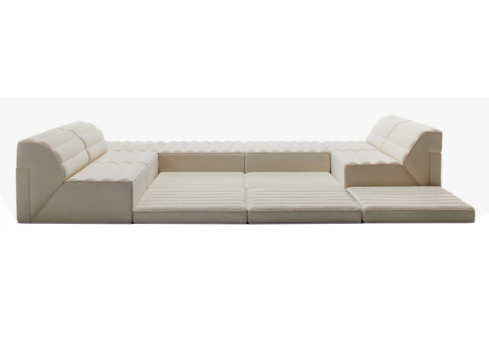 Free System von Claudio Salocchi für Acerbis entworfen ist ein modulares Sofa mit einer tragenden Struktur aus Massivholz und Sperrholz. Die Basis ist mit elastischen Gurten und Kunststofffüßen mit einem versteckten Befestigungssystem zwischen den Modulen angereichert. Die Polsterung besteht aus Polyurethanschaum und Polyesterwatte. Der Sitz- und Rückenbezug besteht aus einem gesteppten Bezug mit geformten Einsätzen aus Polyurethangummi, um mehr Komfort und Weichheit zu bieten. Free System ist in verschiedenen Stoffausführungen erhältlich.