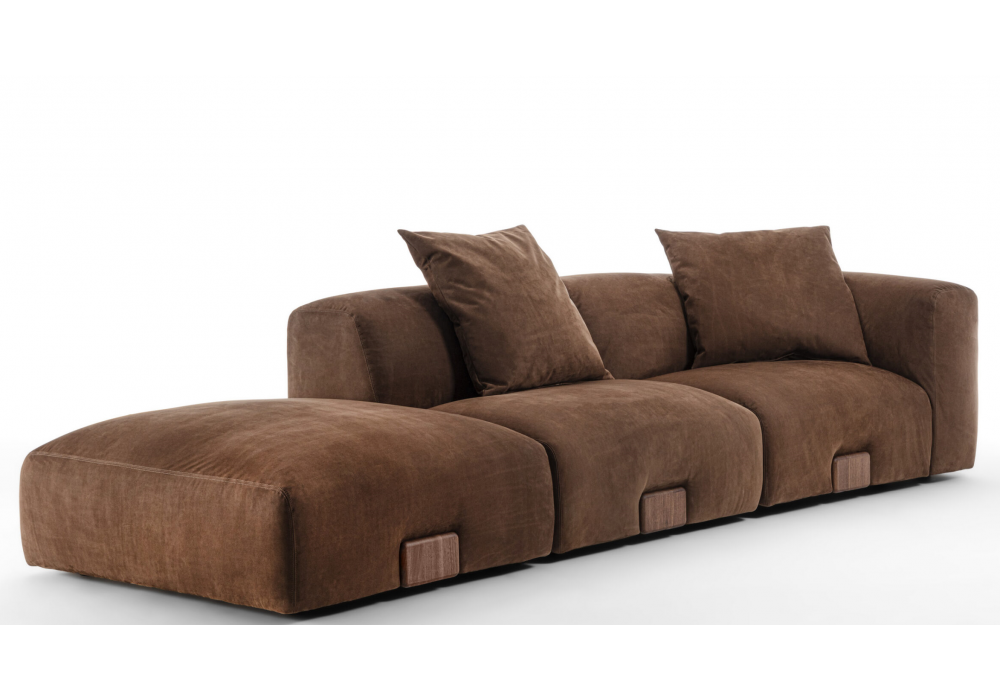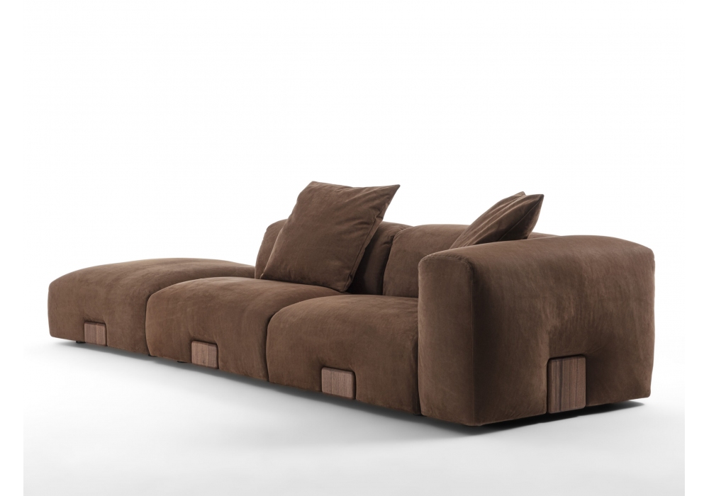 Koji von Giuseppe Viganò für Porada entworfen, ist ein modulares Sofa mit einer Struktur aus massivem Nussbaumholz Canaletta oder Esche und abnehmbarem Stoff- und nicht abnehmbarem Lederbezug. Polsterung aus Polyurethanschaum in unterschiedlichen Stärken und Dichten. Die Polsterung ist im unteren Bereich steifer und gewährleistet so Stabilität. Die obere Schaumstoffschicht ist weniger belastbar, hoch atmungsaktiv und weist eine minimale Restverformung auf.