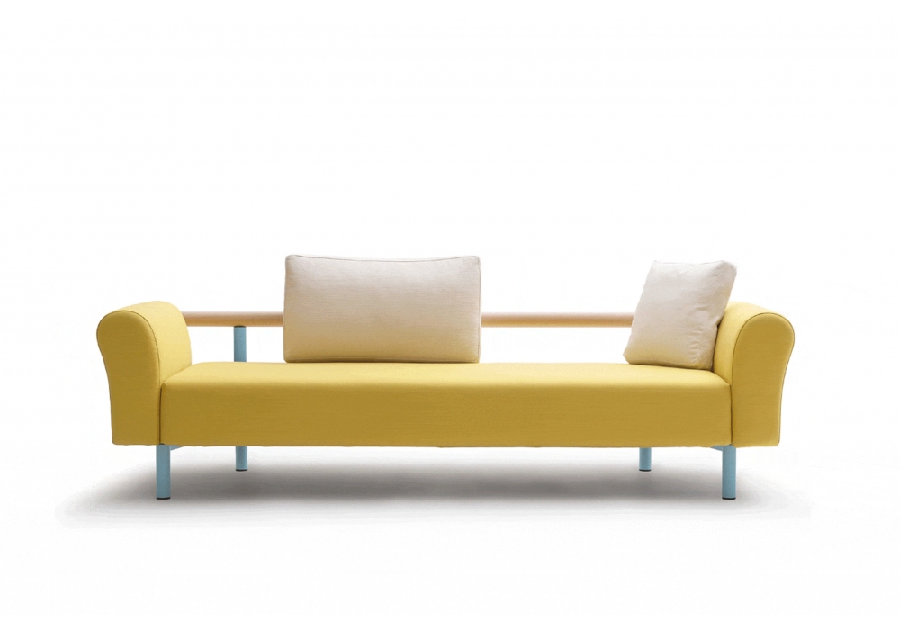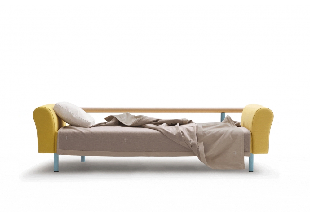 Commedia von Campeggi entworfen, ist ein Daybed mit einer tragenden Struktur aus flüssig lackiertem Eisen, Sitzpolsterung aus Polyurethan und Stoffbezug. Rückenlehnenstange mit rundem Querschnitt aus transparent lackierter Naturbuche.